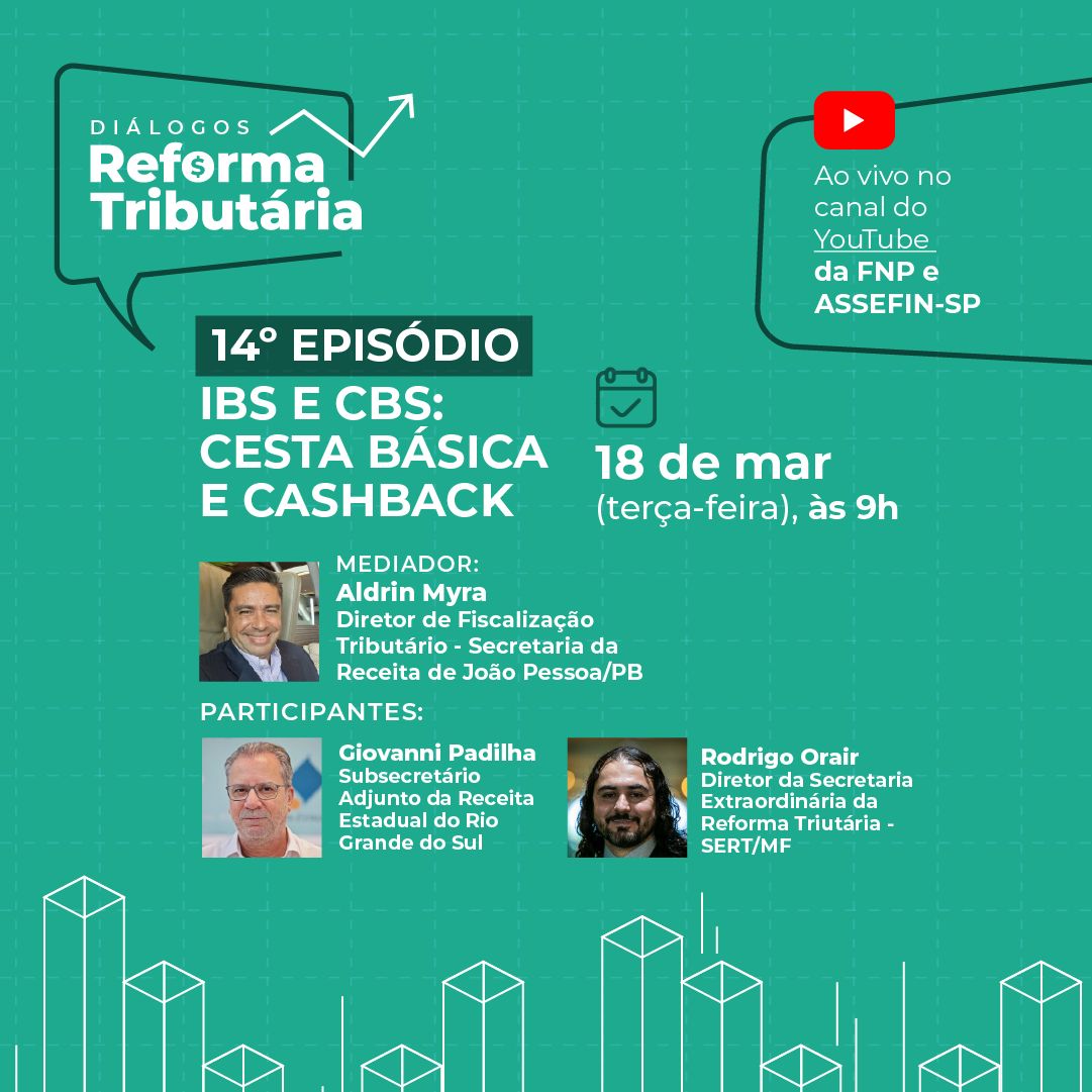 O 14º episódio da série Diálogos Reforma Tributária, promovido pela Frente Nacional de Prefeitos (FNP), ABRASF e ASSEFIN-SP, terá como foco central a discussão sobre o IBS (Imposto sobre Bens e Serviços) e o CBS (Contribuição sobre Bens e Serviços), além de abordar temas relevantes como a Cesta Básica Nacional e o mecanismo de cashback para famílias de baixa renda. O evento ocorrerá no dia 18/03/2025, das 9h às 10h, com transmissão ao vivo pela TVFNP e ASSEFIN-SP.