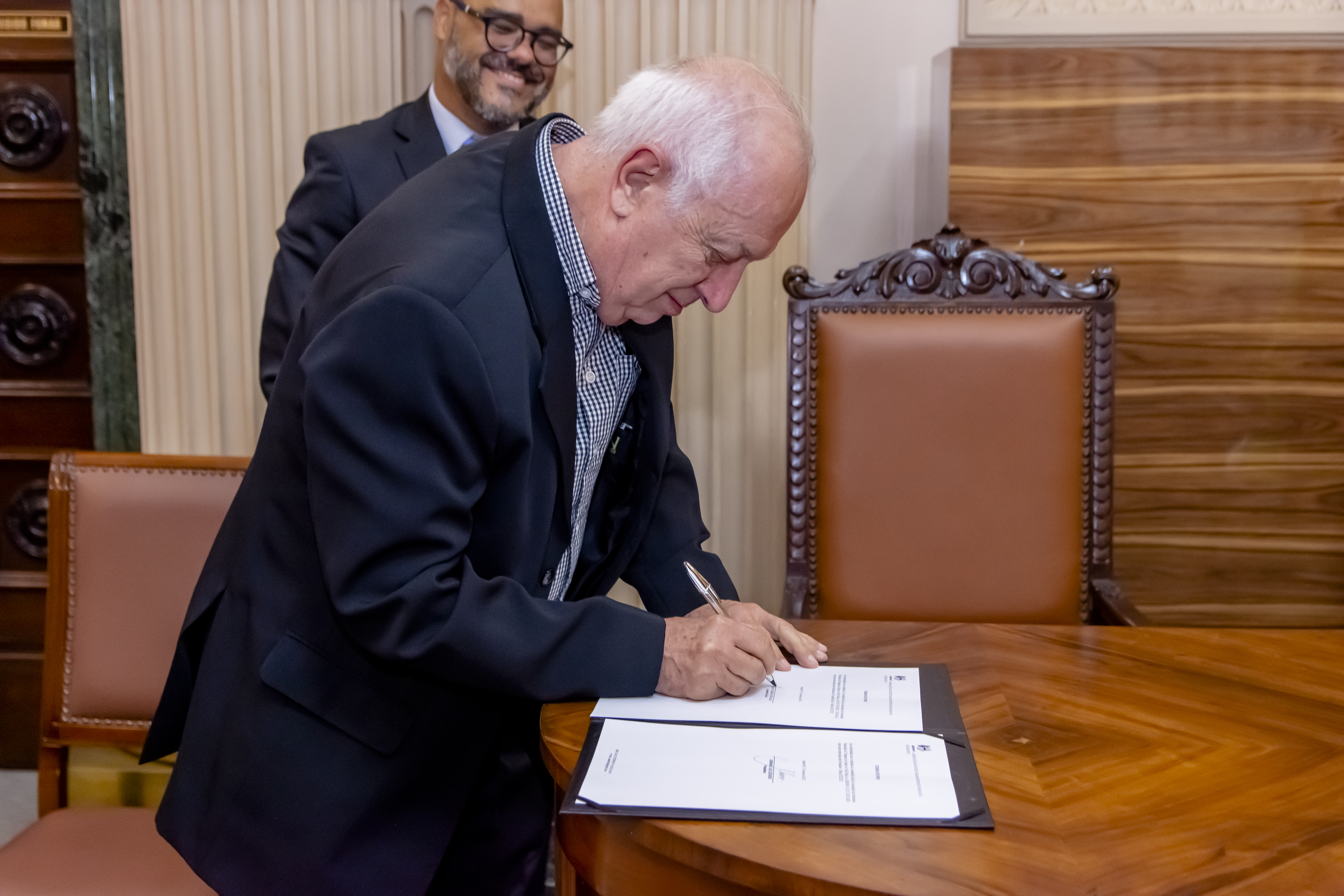 Durante a cerimônia, o secretário de Finanças de Santos, Adriano Luiz Leocadio, foi reconduzido à presidência da ASSEFIN-SP, juntamente com os demais membros da diretoria, para mandato até março de 2025. A solenidade contou com a presença da vice-prefeita de Santos, Renata Bravo, que ressaltou o empenho de Leocadio em acumular a condução das secretarias de Finanças e de Gestão, agora unificadas.