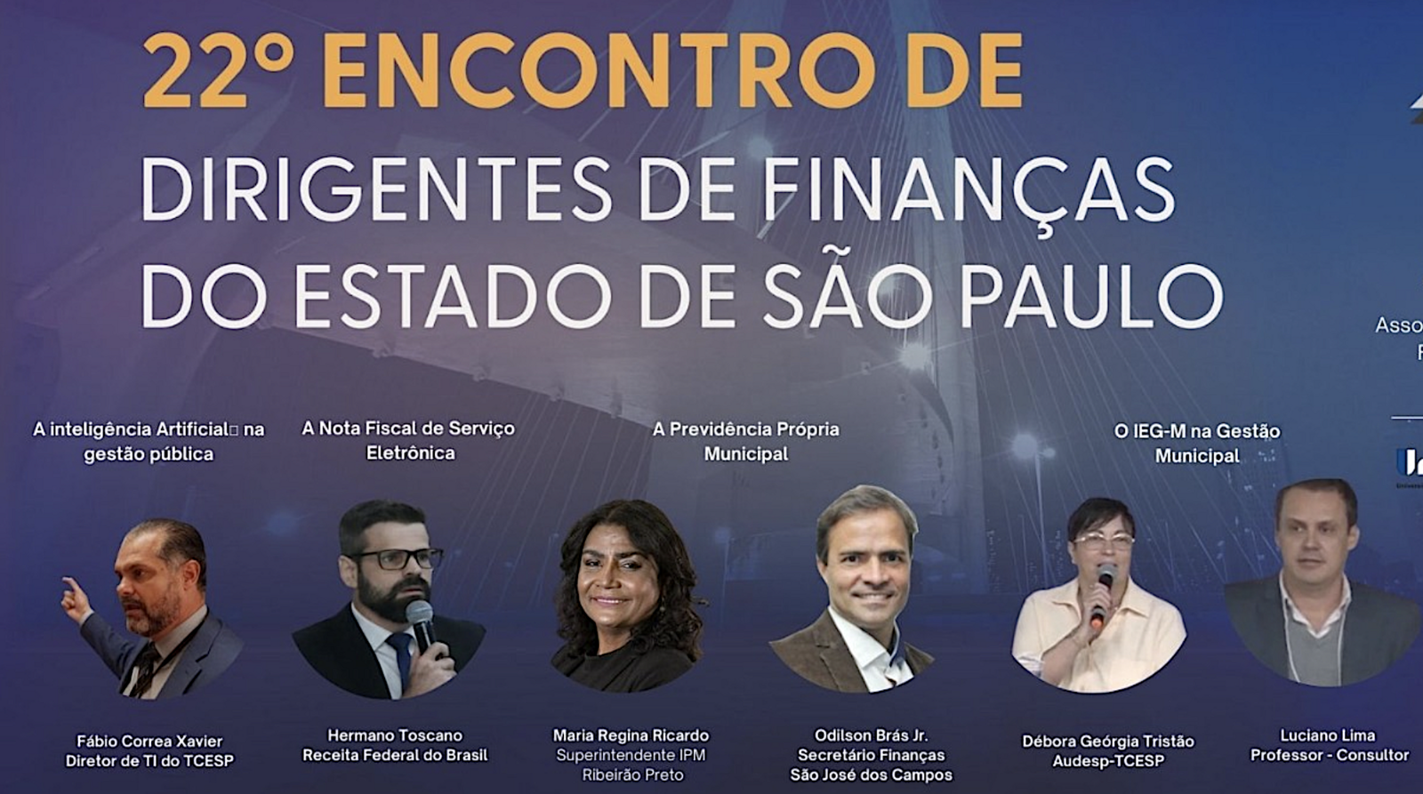 A superintendente do Instituto de Previdência dos Municipários de Ribeirão Preto (IPM), Maria Regina Ricardo, trouxe um retrospecto da previdência municipal e os impactos das reformas recentes. O secretário Odilson Gomes Braz Junior apresentou o case de São José dos Campos, que vinculou o Imposto de Renda Retido na Fonte ao sistema previdenciário local. Débora Geórgia Tristão, do Núcleo AUDESP do TCE-SP, abordou o Índice de Efetividade da Gestão Municipal (IEGM). Francisco Sérgio Nalini, diretor-executivo da ASSEFIN, e Patrícia Loboda Fronzaglia, procuradora e secretária-adjunta de Gestão Administrativa e Finanças de São José, introduziram o tema da importância do Código Tributário Municipal, retomado nas oficinas da tarde.