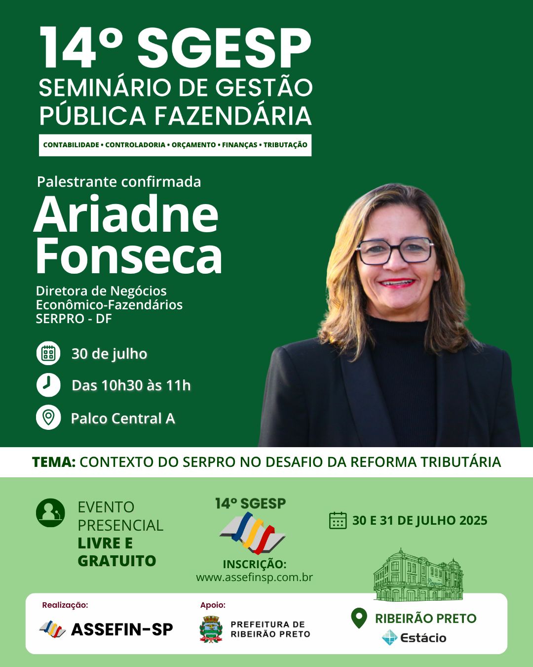 A Diretora de Negócios Econômico-Fazendários do Serpro, Ariadne Fonseca, está confirmada como representante da empresa na abertura oficial do 14.º Seminário de Gestão Pública Fazendária – SGESP, no dia 30/7, 9 horas, o seminário vai até às 17h30 do dia 31 de julho de 2025, (dois dias) na Universidade Estácio de Ribeirão Preto. Ariadne participará do evento representa o Serpro, e seu presidente, Alexandre Gonçalves de Amorim, que teve impedimento de agenda.