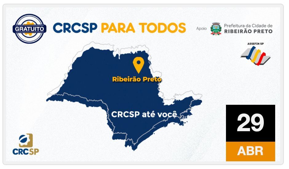 Também amanhã (29/4), das 14h30 às 16h30, o Conselho Regional de Contabilidade do Estado de São Paulo realizará a atividade "CRCSP para todos em Ribeirão Preto apresenta: Reforma Tributária e os Reflexos na Área Pública".