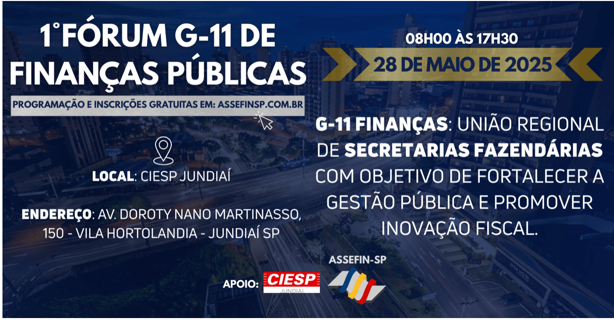 No dia 28 de maio de 2025, quarta-feira, das 9h às 17h30, será realizado o 1.º Fórum Regional de Finanças Públicas, promovido pelo G-11 Finanças — grupo que reúne secretários fazendários de 11 municípios paulista, com apoio da ASSEFIN-SP.