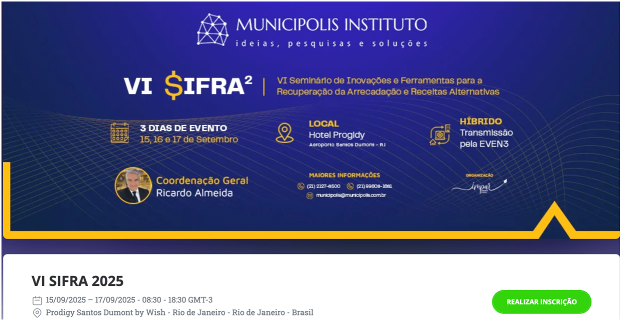 O VI SIFRA — Seminário de Inovações e Ferramentas para a Recuperação da Arrecadação e Receitas Alternativas — acontecerá de 15 a 17 de setembro de 2025, no Hotel Prodigy, ao lado do Aeroporto Santos Dumont, no Rio de Janeiro.