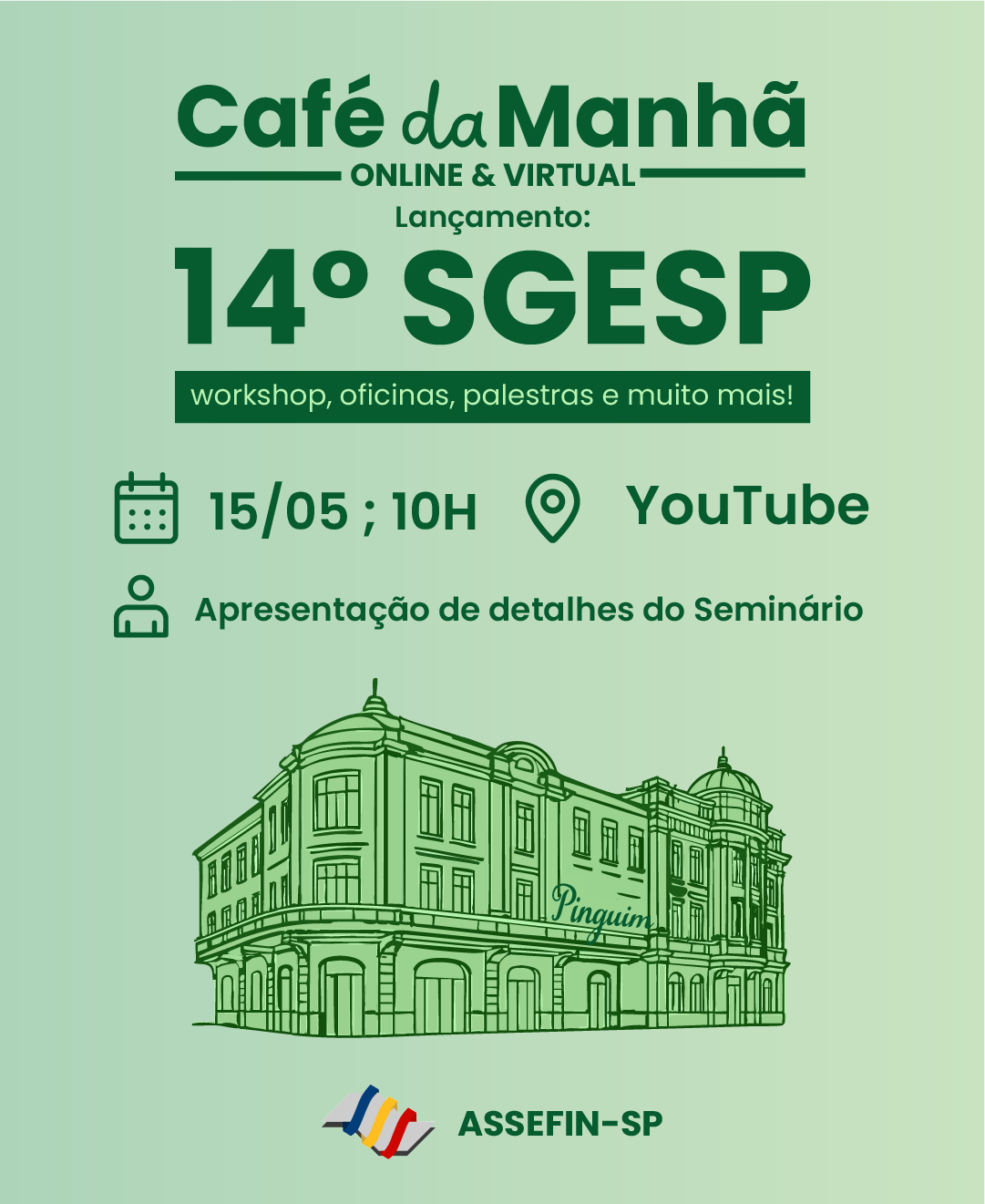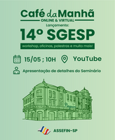 Para apresentar oficialmente a programação e os diferenciais da 14.ª edição do Seminário de Gestão Pública Fazendária – SGESP, será realizado na quinta-feira, 15 de maio, às 10h, um café da manhã virtual, com transmissão ao vivo pelo canal da ASSEFIN-SP no YouTube.