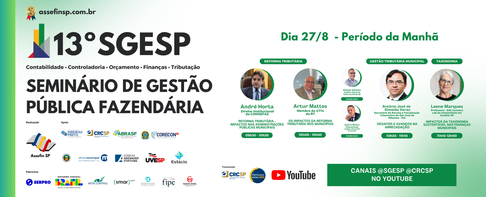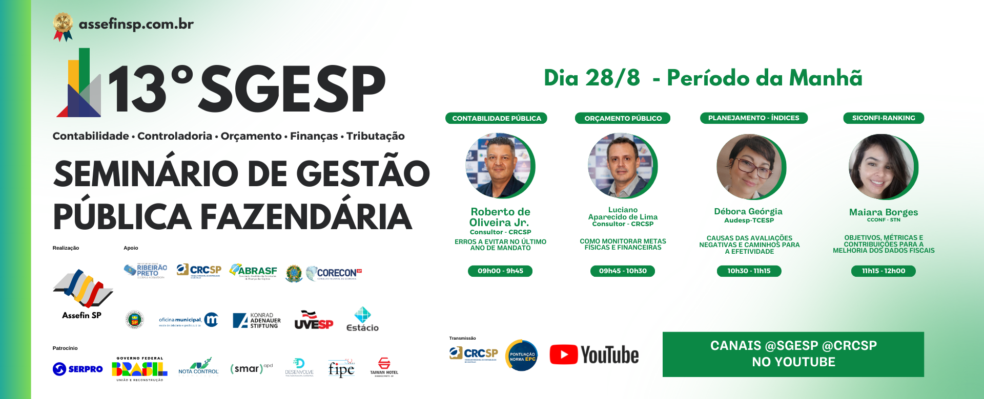 Nos dias 27 e 28 de agosto, o CRCSP (Conselho Regional de Contabilidade de São Paulo) e a ASSEFIN-SP (Associação das Secretarias Municipais do Estado de SP) transmitirão o 13.º SGESP no YouTube. Este evento, que será gratuito e aberto a todos, apresentará uma versão editada e gravada do encontro presencial realizado nos dias 24 e 25 de julho na Universidade Estácio, em Ribeirão Preto. O objetivo é ampliar o alcance das discussões e treinamentos oferecidos aos profissionais da área.