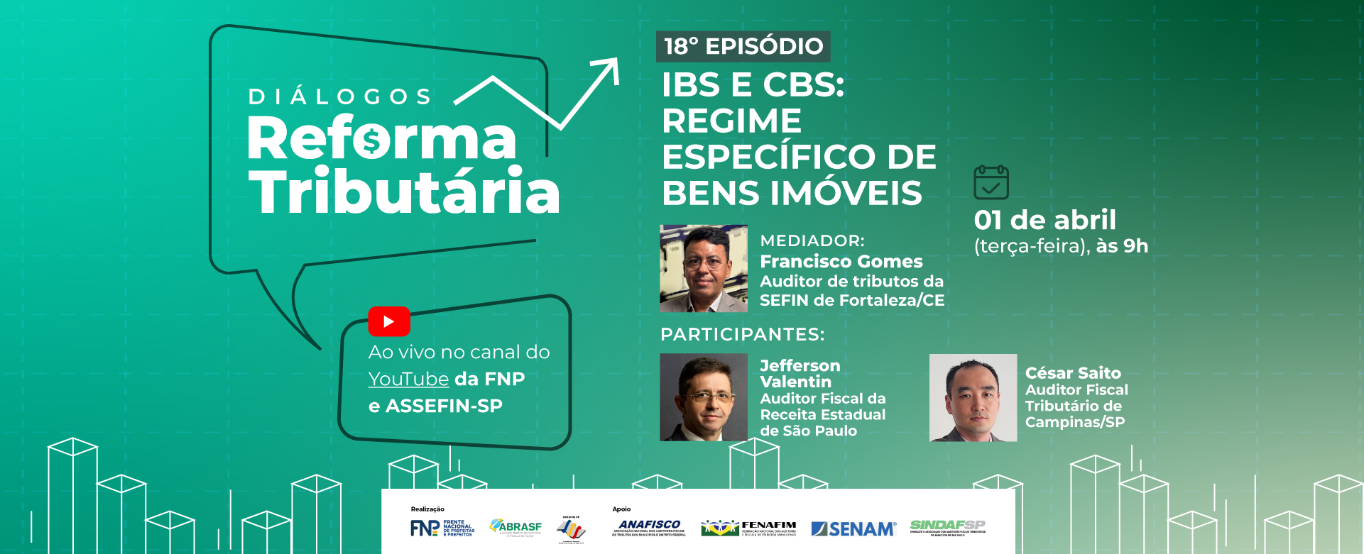 A Frente Nacional de Prefeitos (FNP), a Associação Brasileira das Secretarias de Finanças das Capitais (ABRASF) e a Associação das Secretarias Municipais de Finanças do Estado de São Paulo (ASSEFIN-SP) promovem, no dia 1º de abril de 2025, terça-feira, das 9h às 10h (horário de Brasília), o 18º episódio da série "Diálogos Reforma Tributária", com transmissão ao vivo pelos canais TVFNP e ASSEFIN-SP.