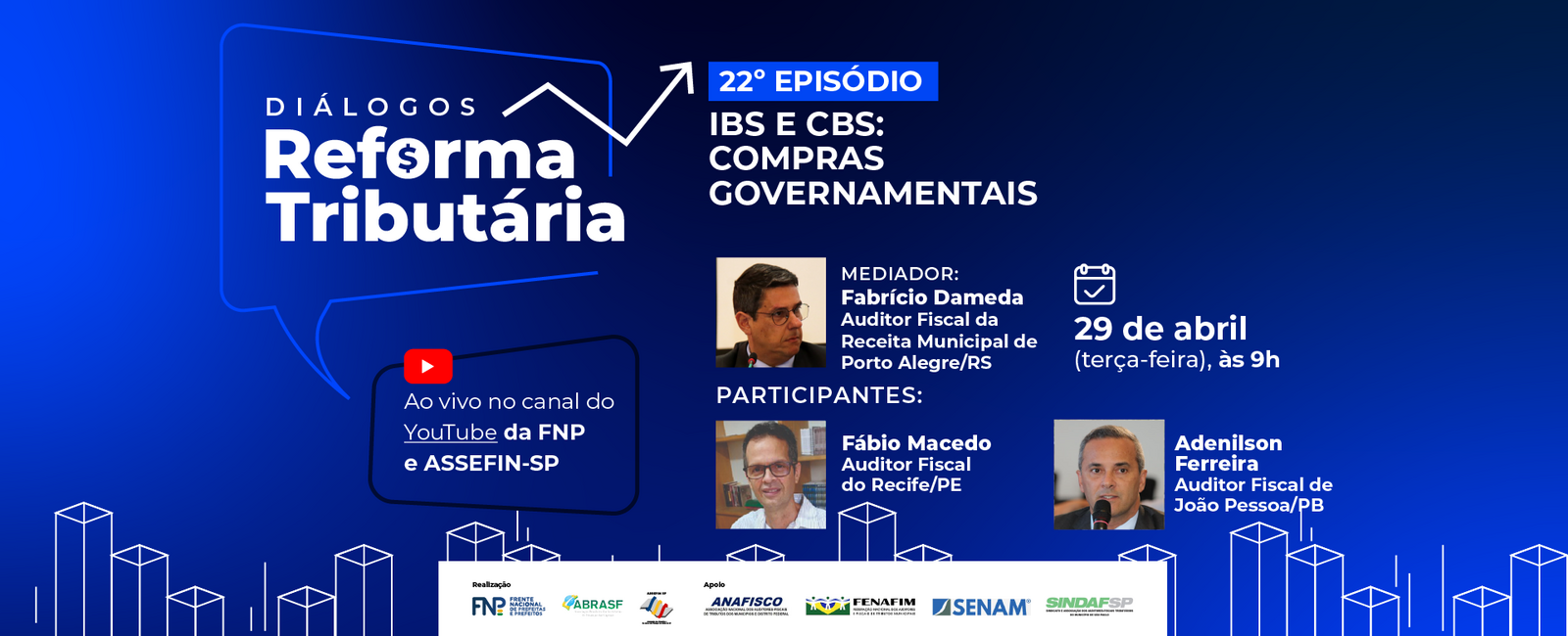 A Frente Nacional de Prefeitos (FNP), a Associação Brasileira das Secretarias de Finanças das Capitais (ABRASF) e a Associação das Secretarias Municipais de Finanças do Estado de São Paulo (ASSEFIN-SP) promovem, no dia 29 de abril de 2025 (terça-feira), das 9h às 10h (horário de Brasília), o 22º episódio da série "Diálogos Reforma Tributária", com transmissão ao vivo pelos canais TVFNP e ASSEFIN-SP.