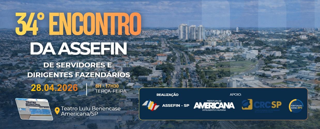 Estão abertas as inscrições para o 34º Encontro de Servidores e Titulares Fazendários da ASSEFIN-SP, que será realizado no dia 28 de abril de 2026, no Teatro Municipal “Lulu Benencase”, em Americana/SP.