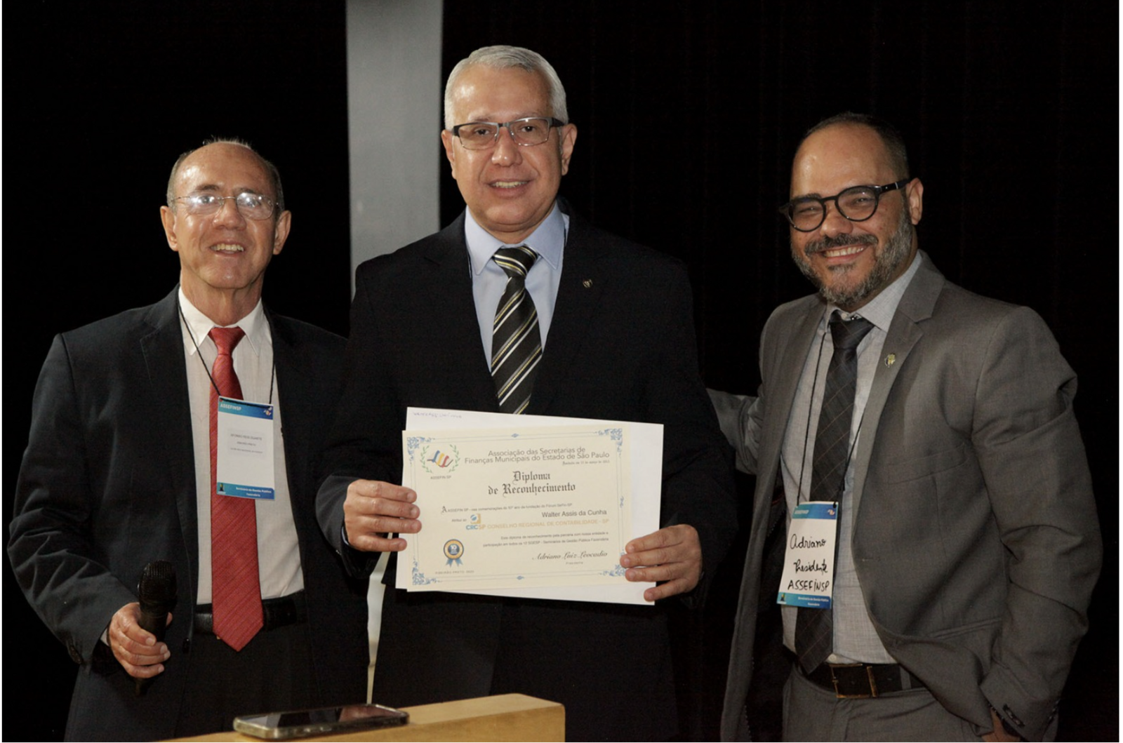 O CRCSP recebeu, através da conselheira e vice-presidente Flávia Augusto, um diploma entregue pelo presidente da ASSEFIN, Adriano Luiz Leocadio (foto acima), este diploma também é comemorativo pelos 10 da associação. Flávia representava o atual presidente do CRCSP José Aparecido Maion na abertura do evento,