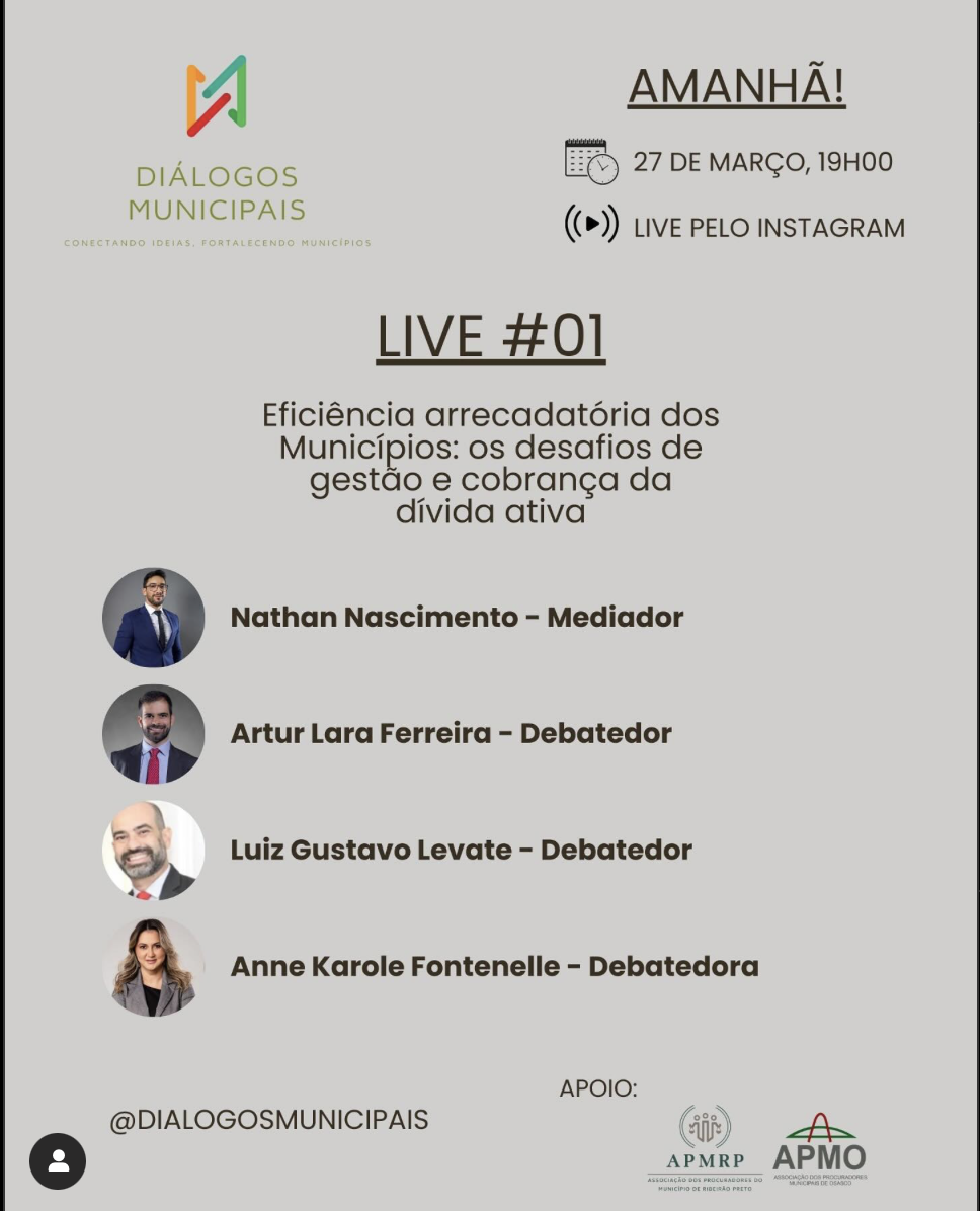 A live de estreia contará com a participação de Anne Karole Fontenelle (ANPM), Artur Lara Ferreira (APMO), Luiz Gustavo Levate e Nathan Nascimento (APMRP), abordando estratégias para a cobrança da dívida ativa e a sustentabilidade financeira das cidades. A transmissão será realizada pelo Instagram (@dialogosmunicipais), permitindo a interação do público com os especialistas.