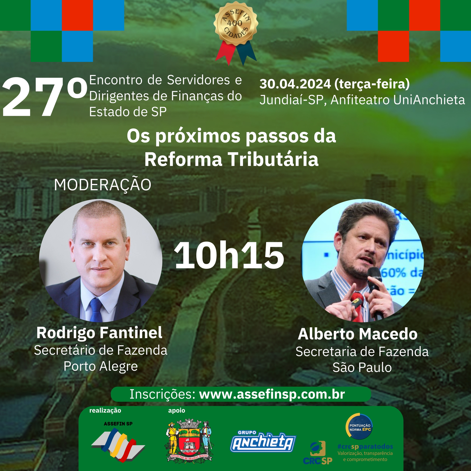 Rodrigo Fantinel, presidente da ABRASF, Associação das Secretarias Municipais de Finanças das Capitais Brasileiras, e Secretário da Fazenda de Porto Alegre, já confirmou sua presença. "Espero ter um diagnóstico das atividades dos colegas paulistas. Sabemos que, apesar da diferença de população entre algumas cidades e capitais brasileiras, os problemas são os mesmos, só mudam de tamanho, população e intensidade", disse o presidente da ABRASF.