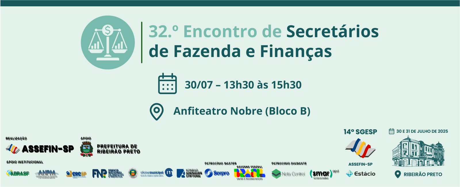 O 14.º Seminário de Gestão Pública Fazendária – SGESP, que será realizado nos dias 30 e 31 de julho de 2025, na Universidade Estácio de Ribeirão Preto, já se consolida como um dos eventos mais estratégicos do calendário da administração pública municipal. Com foco nos desafios e inovações da gestão fazendária, a programação contará com painéis interativos, oficinas técnicas e encontros de alto nível que prometem qualificar ainda mais os debates sobre tributação, contabilidade pública e reforma fiscal. Confira os destaques confirmados:
