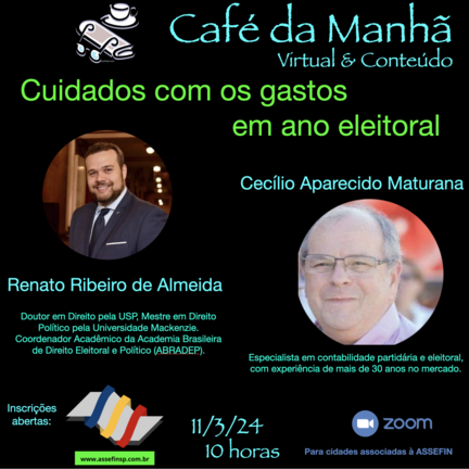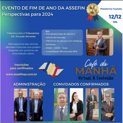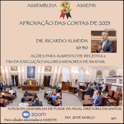 A ASSEFIN realizou assembleia virtual para aprovação das contas do ano de 2023. Em primeiro momento a participação foi fechada no ambiente da plataforma Zoom, mas, às 16h30, ela foi aberta para servidores das cidades filiadas, quando houve a presença do advogado tributarista Ricardo Almeida, palestrando.           A fórmula de realizar palestras durante suas assembléias foi testada com sucesso em eventos anteriores, modelo que vem sendo utilizado desde o nascimento da ASSEFIN, ten ...