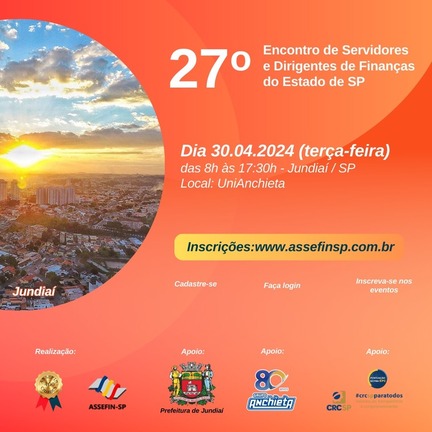 A ASSEFIN, com apoio da Secretaria de Gestão em Finanças da Prefeitura de Jundiaí, da UniAnchieta e do CRCSP, realizou o seu 27º Encontro em Jundiaí. A novidade foi que as Oficinas ocorreram todas no salão principal, onde também aconteceu a abertura, divididas apenas em horários, não havendo necessidade do deslocamento dos participantes. Somente os Secretários e colegas com funções semelhantes tiveram sua tradicional reunião em um local separado.
