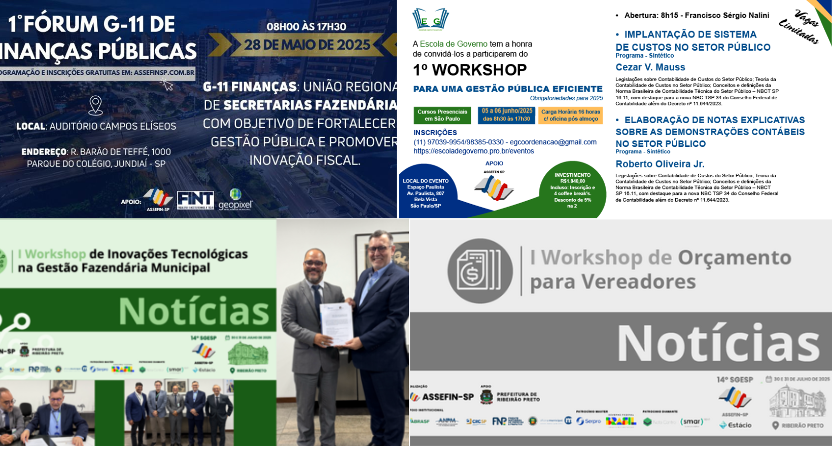 Nos próximos meses, importantes eventos apoiados pela ASSEFIN-SP movimentarão a agenda da gestão pública fazendária no Estado de São Paulo. Confira a seguir os principais encontros confirmados, voltados ao fortalecimento da governança fiscal, inovação administrativa e preparação para os desafios da Reforma Tributária: