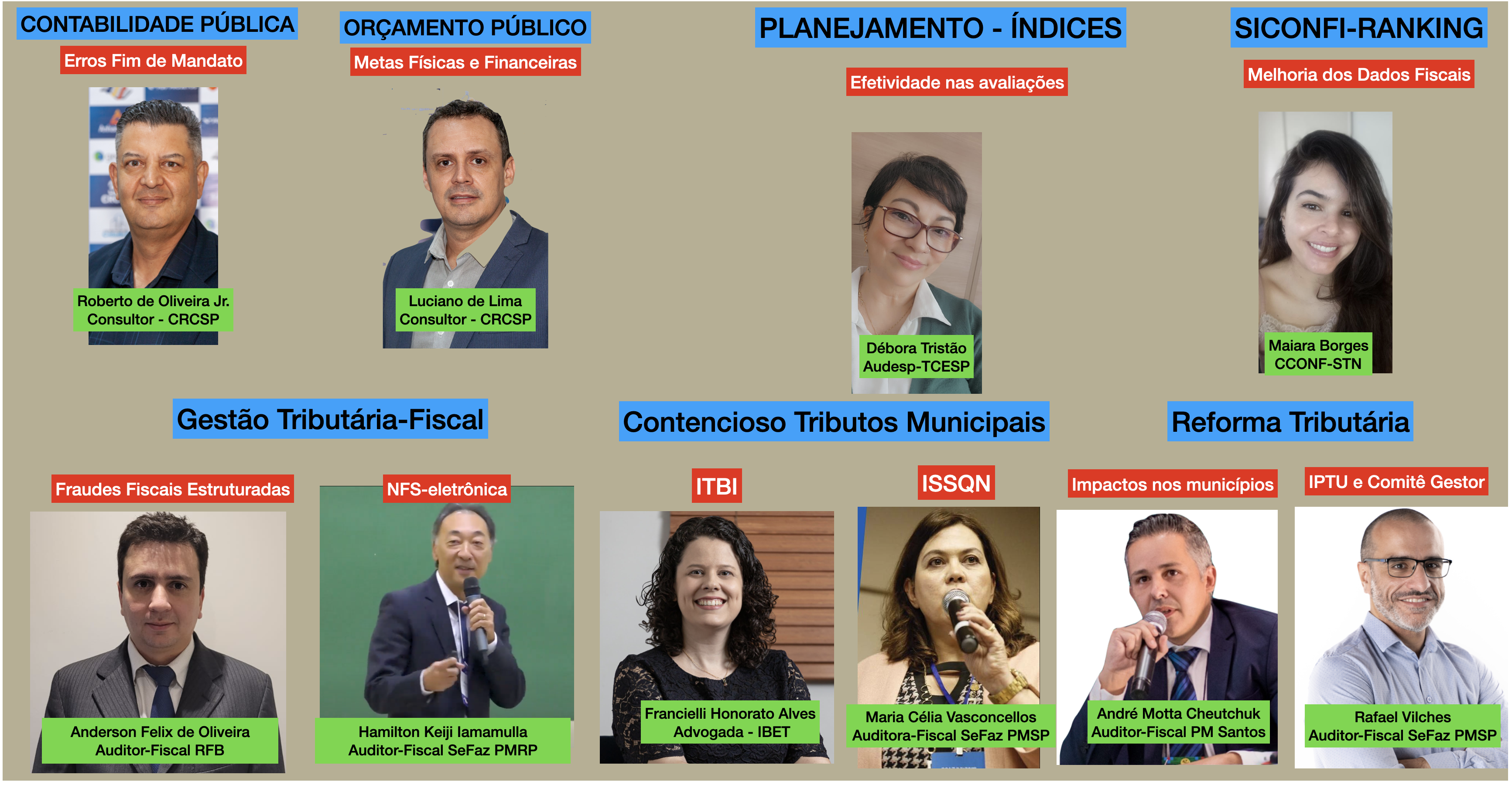 À tarde, o painel V - Fraudes Fiscais Estruturadas, das 13:30 às 14:00, será conduzido por Anderson Félix de Oliveira, que falará sobre “Prevenção de Riscos em Recuperação de Créditos Tributários de Prefeituras”, alertando sobre golpes e prevenções adequadas.