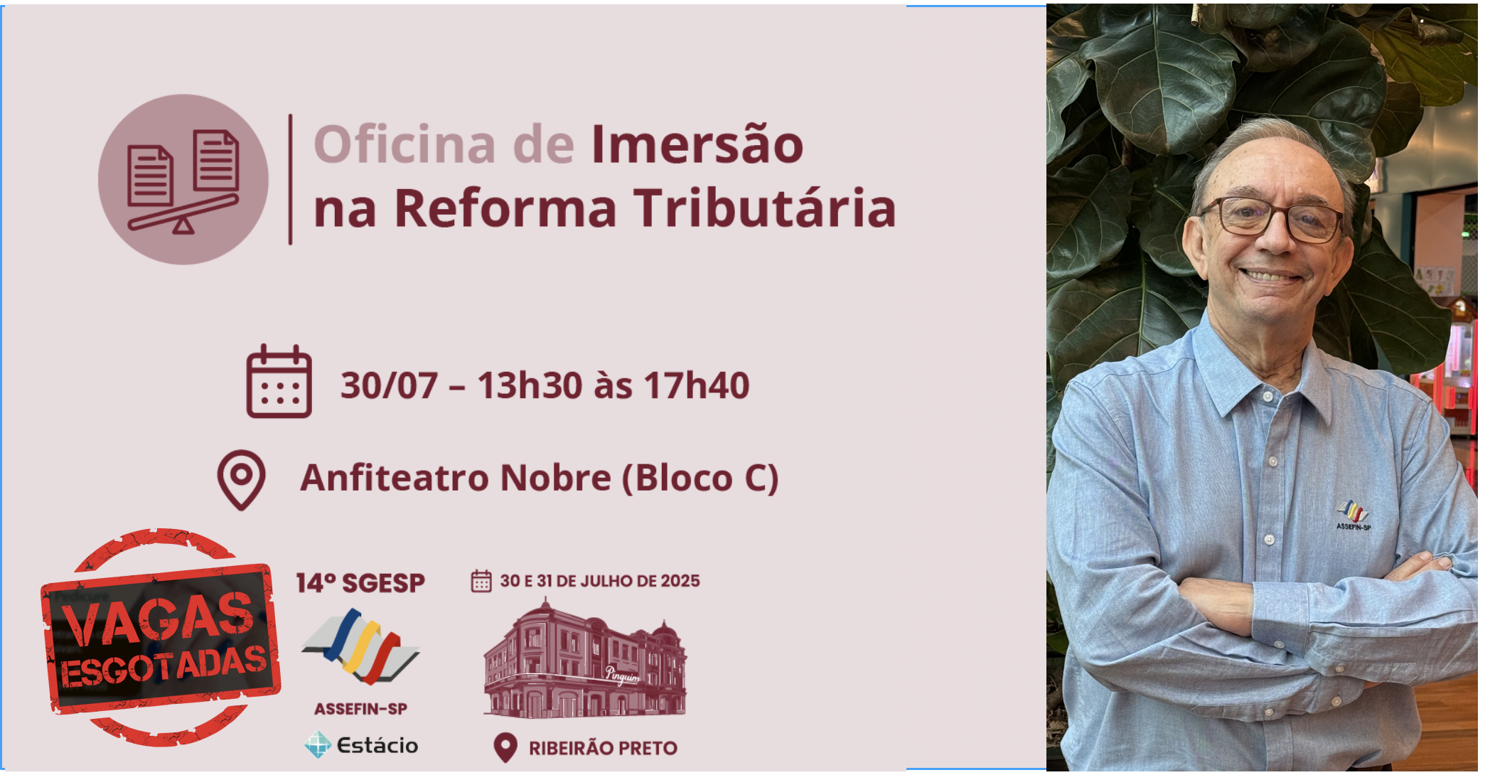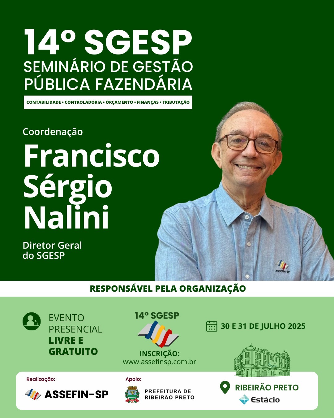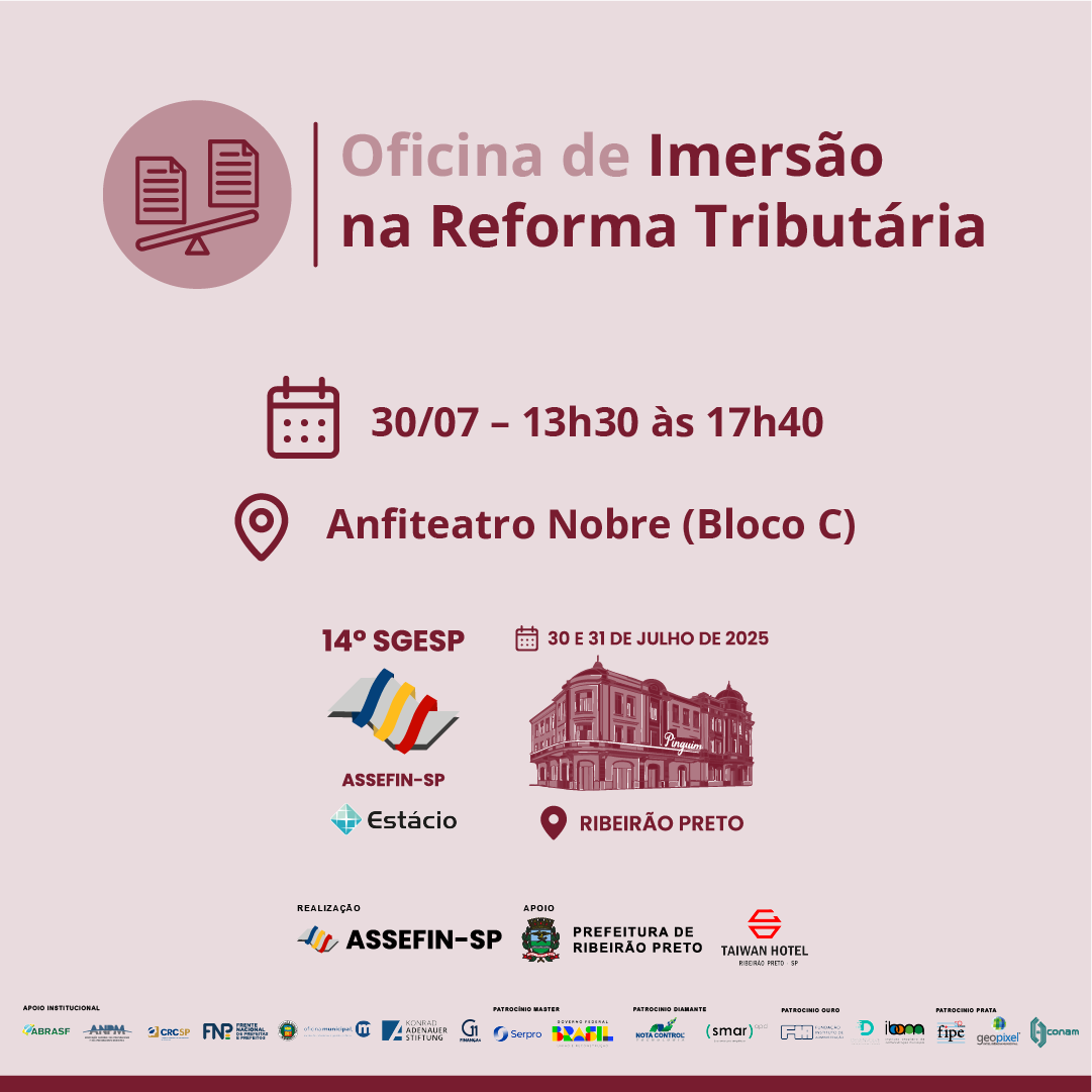 O 14.º Seminário de Gestão Pública Fazendária – SGESP, que acontece nos dias 30 e 31 de julho de 2025, na Universidade Estácio de Ribeirão Preto, já supera as expectativas e se confirma como a maior edição desde a criação do evento, promovido pela ASSEFIN-SP. Com mais de 500 participantes confirmados, o seminário amplia sua programação técnica, fortalece o debate sobre a Reforma Tributária e alcança um novo patamar de relevância para os municípios.