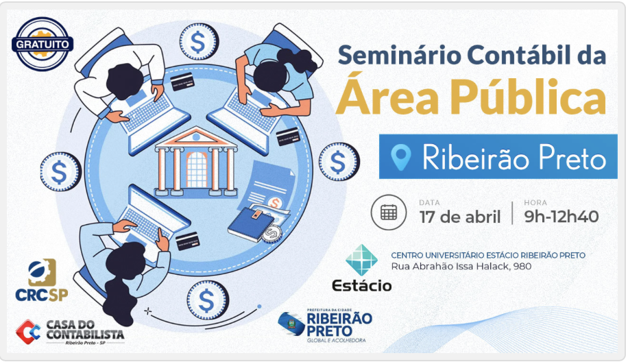 O CRCSP, em parceria com a Casa do Contabilista de Ribeirão Preto, convida você a participar do "Seminário Contábil da Área Pública em Ribeirão Preto", no dia 17 de abril, das 9h às 12h40, no Centro Universitário Estácio, localizado na Rua Abrahão Issa Halack, 980 - Ribeirânia - Ribeirão Preto/SP.
