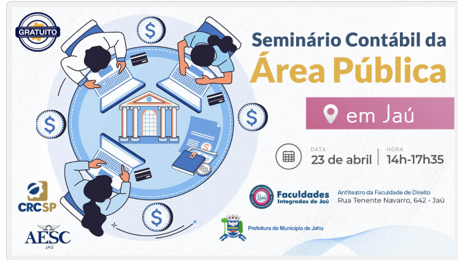 O CRCSP convida você a participar do "Seminário Contábil da Área Pública em Jaú", no dia 23 de abril, das 14h às 17h35, na Faculdades Integradas de Jaú - Anfiteatro da Faculdade de Direito, localizada na Rua Tenente Navarro, 642 - Chácara Braz Miraglia - Jaú/SP.
