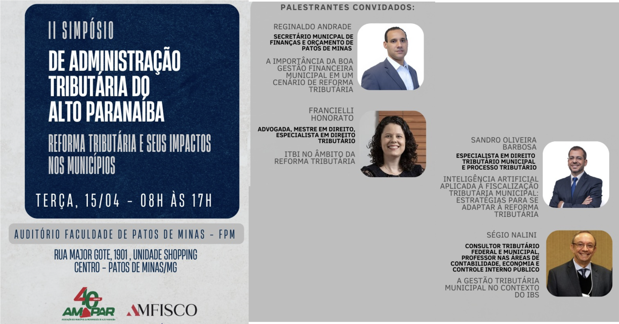 No próximo 15 de abril, a cidade de Patos de Minas-MG será palco do II Simpósio de Administração Tributária do Alto Paranaíba, promovido pela AMAPAR – Associação dos Municípios da Microrregião do Alto Paranaíba, em parceria com a AMFISCO – Associação dos Membros dos Fiscos Municipais do Estado de Minas Gerais.