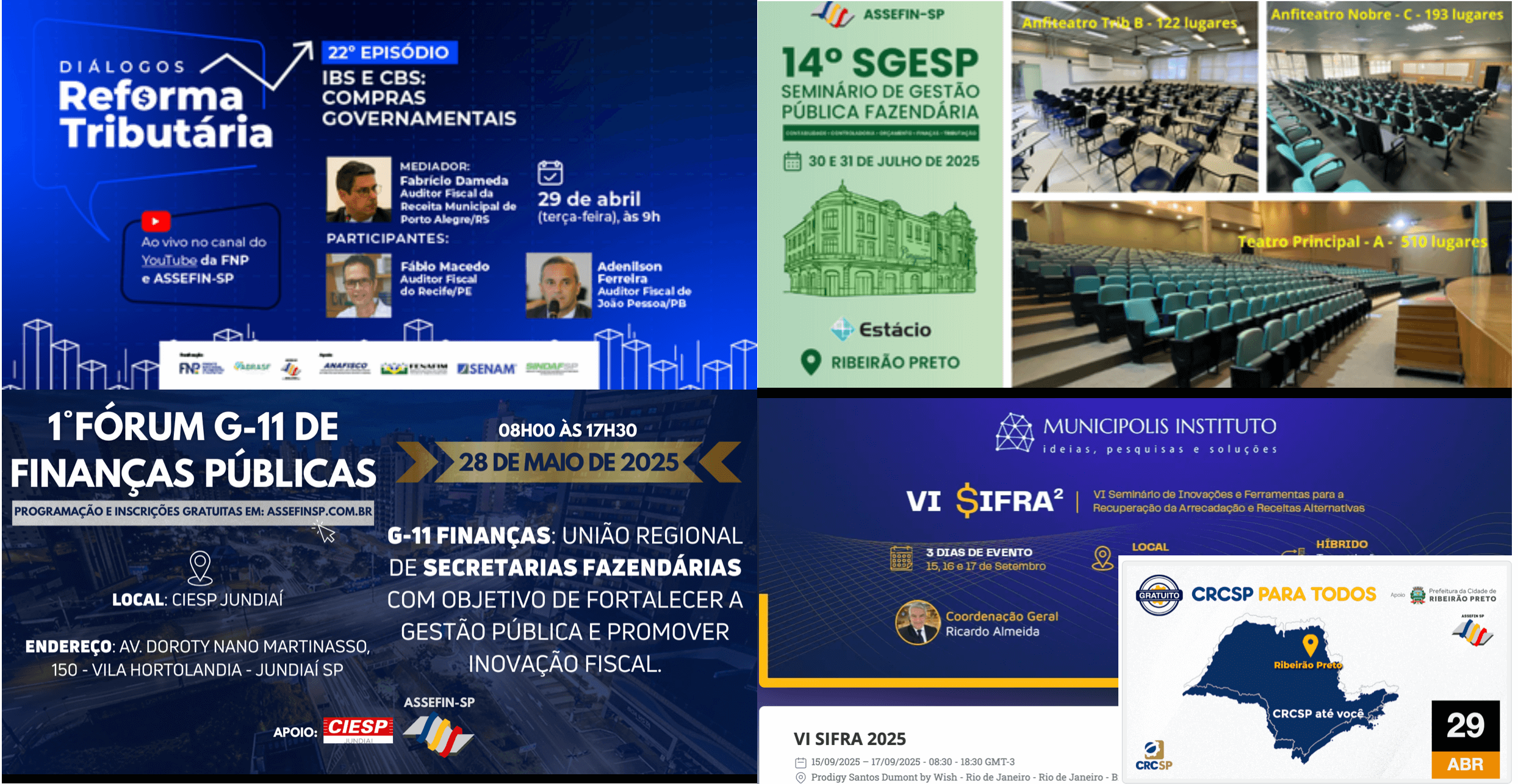 A ASSEFIN-SP e seus parceiros anunciam uma série de eventos importantes o para o setor de finanças públicas, amanhã (29/4) e para as próximas semanas, reforçando o calendário de debates, inovações e lançamentos na área tributária e fazendária.