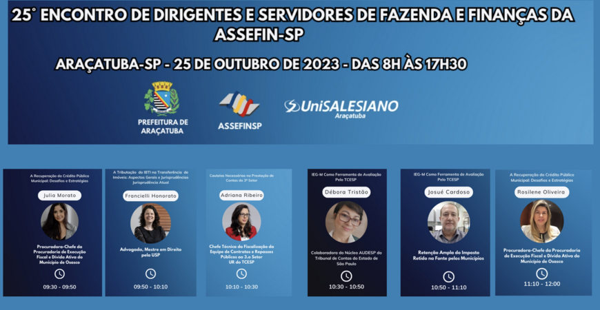A ASSEFIN anunciou hoje as 17 palestras que serão realizadas no 25.o Encontro de Dirigentes e Servidores das Áreas de Fazenda e Finanças, em Araçatuba, dia 25 de outubro, no palco principal e na sala 2 da Unisalesiano daquela cidade. Dez palestrantes intercalarão palestras e debates em oficinas específicas