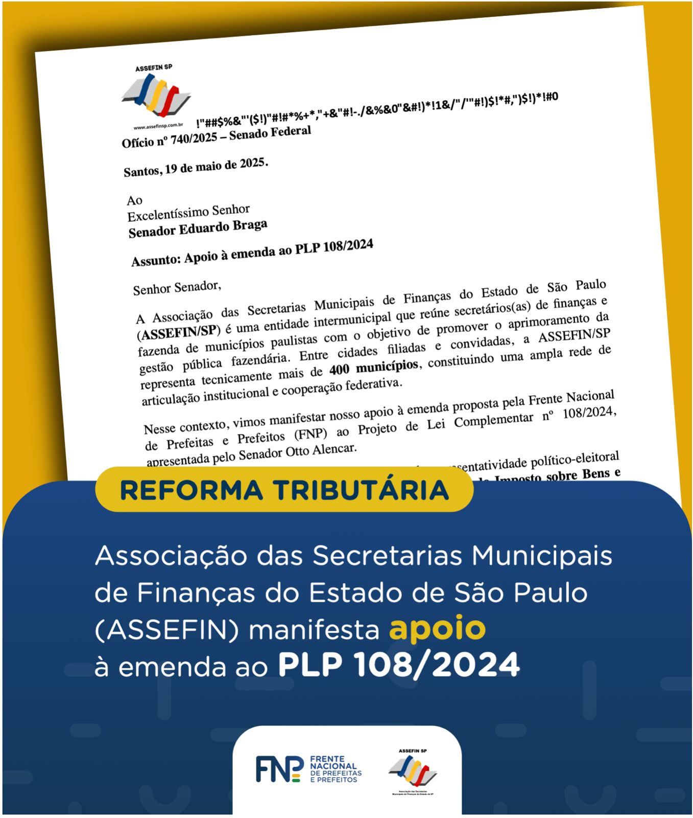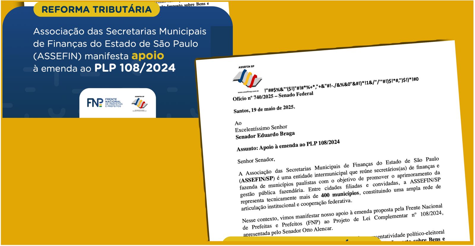 A Associação das Secretarias Municipais de Finanças do Estado de São Paulo (ASSEFIN-SP) declarou ontem, (19/5) apoio institucional à emenda proposta pela Frente Nacional de Prefeitas e Prefeitos (FNP) ao Projeto de Lei Complementar (PLP) nº 108/2024, apresentada pelo senador Otto Alencar. A proposta trata da composição do Conselho Superior do Comitê Gestor do Imposto sobre Bens e Serviços (IBS), eixo fundamental da reforma tributária em tramitação.