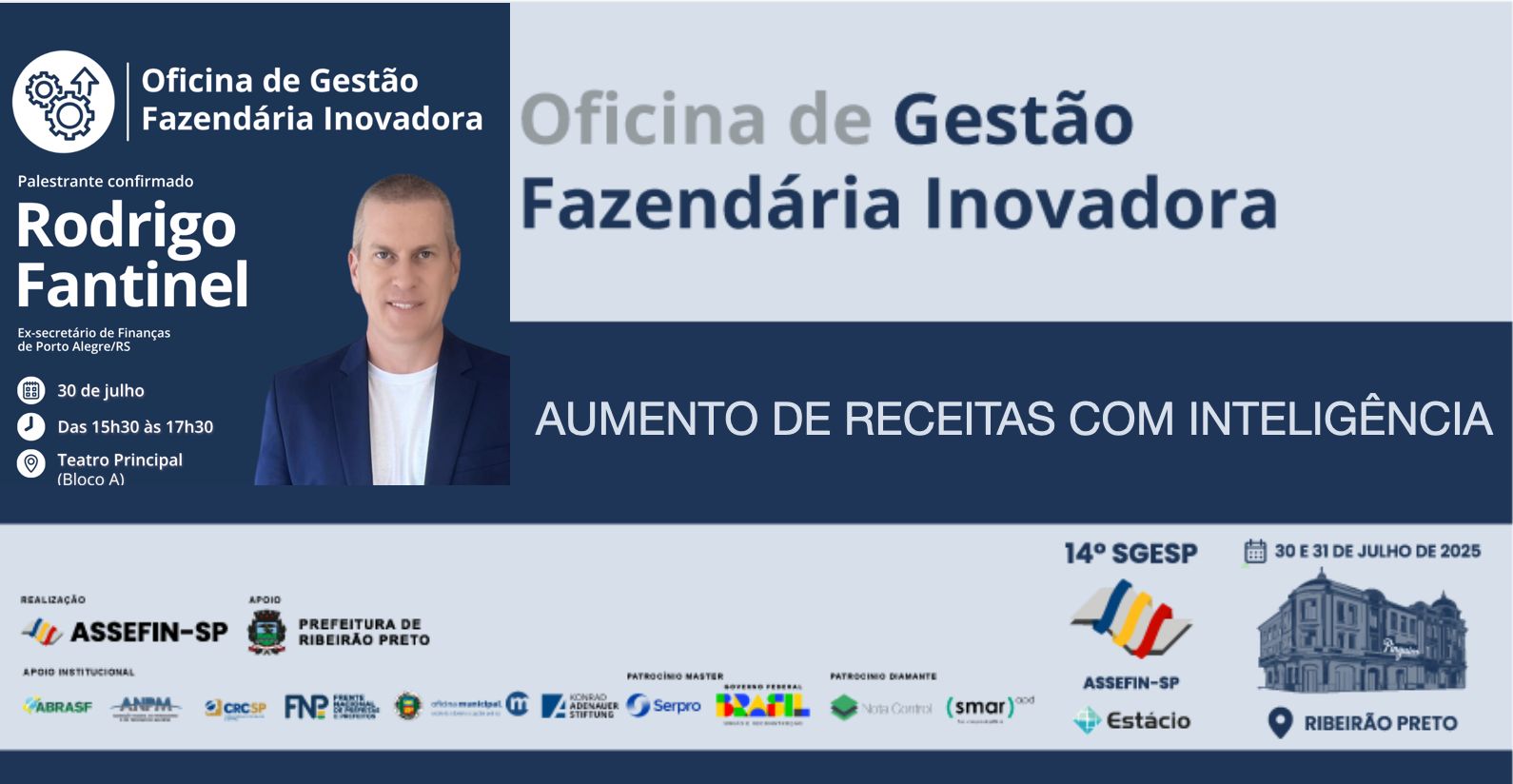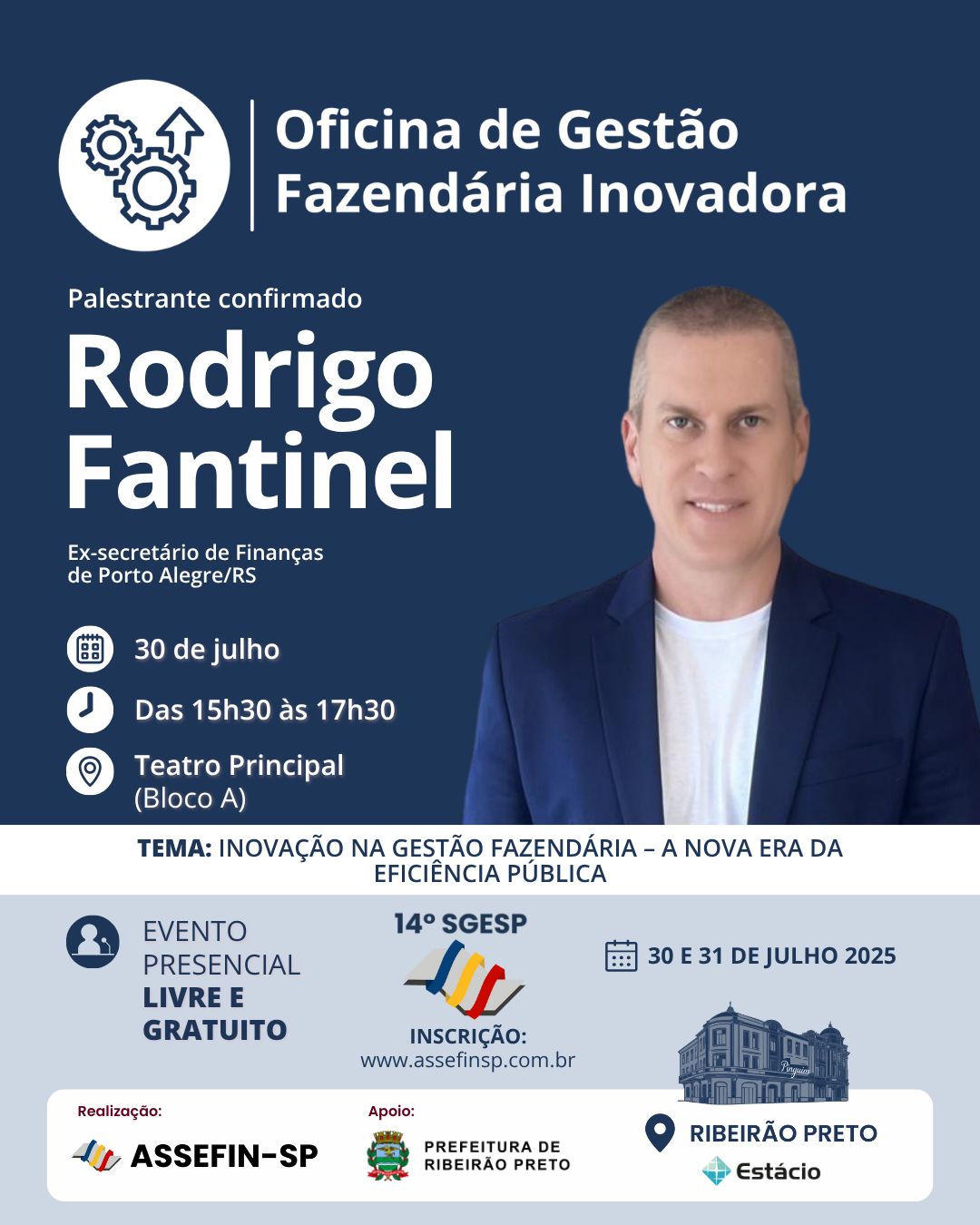 No dia 30 de julho, às 15h30, o Teatro Principal da Universidade Estácio de Ribeirão Preto receberá um dos painéis mais aguardados do 14.º Seminário de Gestão Pública Fazendária – SGESP: “Inovação na Gestão Fazendária – A nova era da eficiência pública”, conduzido por Rodrigo Fantinel.