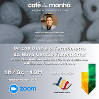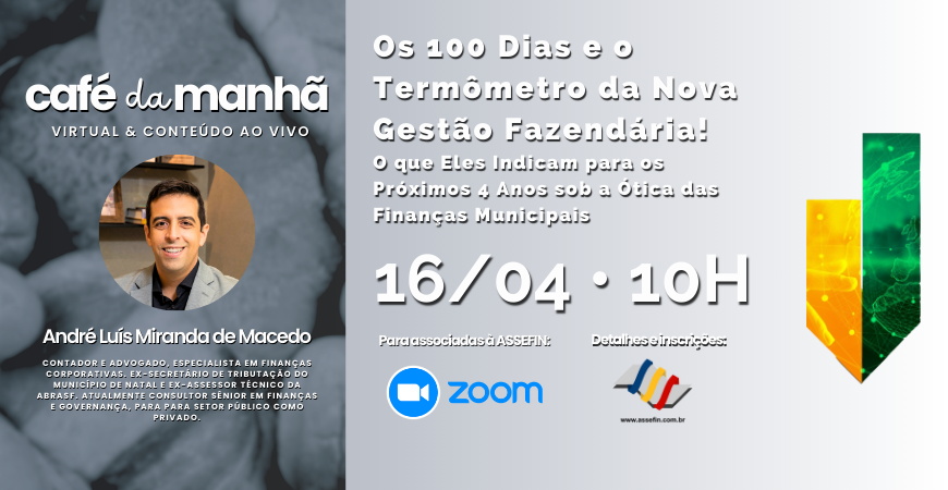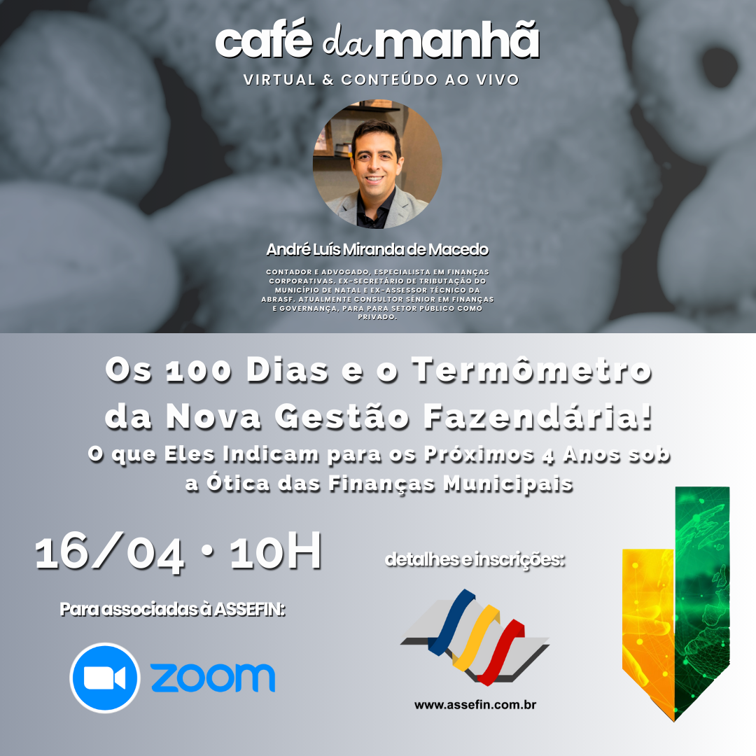 A ASSEFIN realiza, no próximo dia 16 de abril, às 10h, o 35.º Café da Manhã – Virtual & Conteúdo, com a participação especial do tributarista André Macedo, que conduzirá um bate-papo sobre o tema “Os primeiros 100 dias e o papel estratégico das finanças públicas”. A conversa será realizada pela plataforma Zoom e é voltada a dirigentes, gestores e servidores públicos das cidades associadas à entidade.