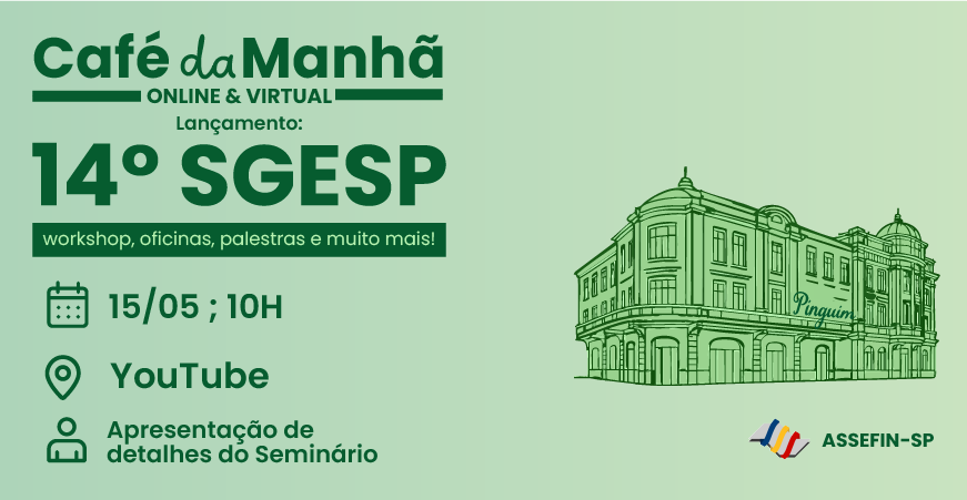 Para apresentar oficialmente a programação e os diferenciais da 14.ª edição do Seminário de Gestão Pública Fazendária – SGESP, será realizado na quinta-feira, 15 de maio, às 10h, um café da manhã virtual, com transmissão ao vivo pelo canal da ASSEFIN-SP no YouTube.