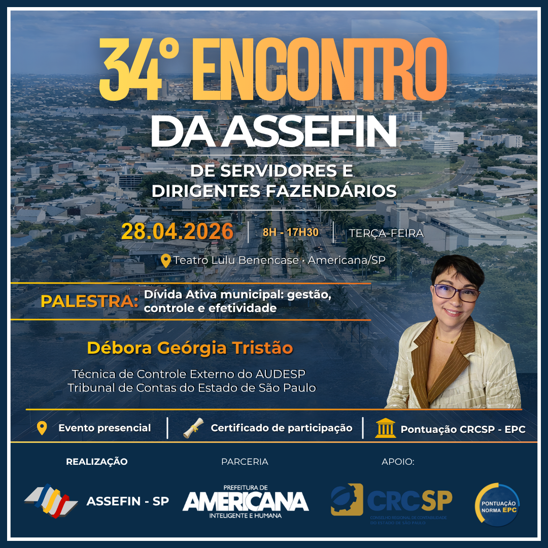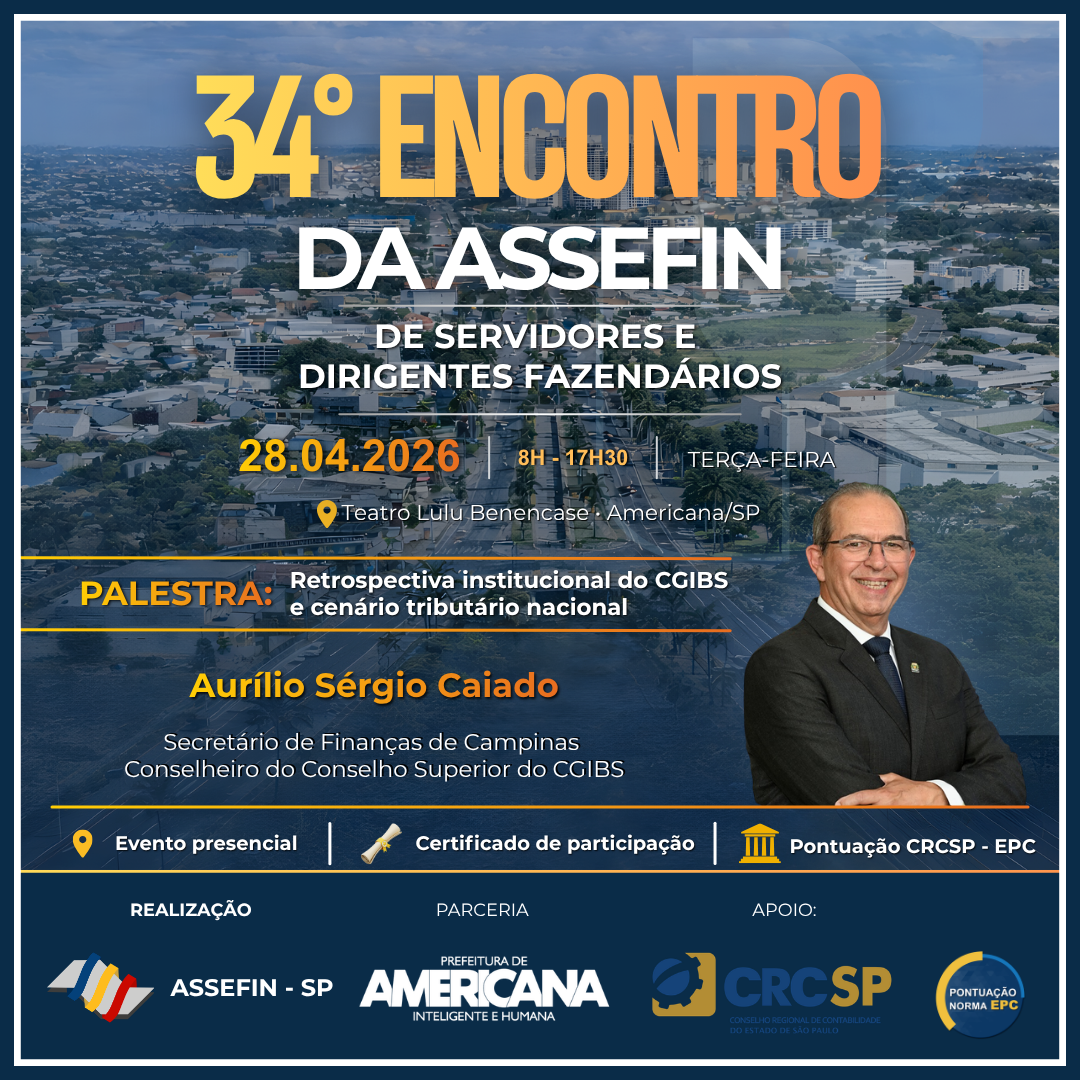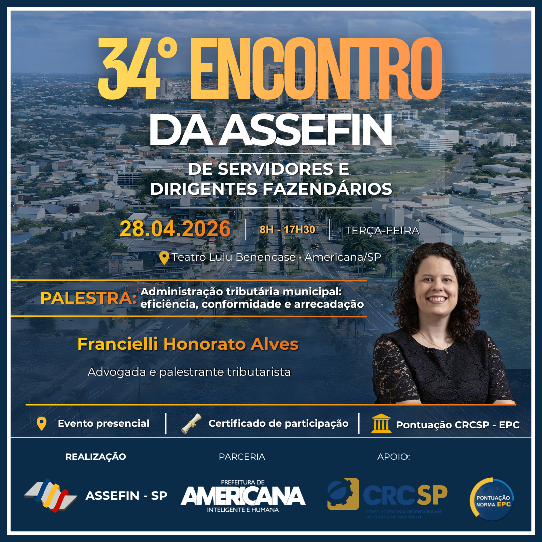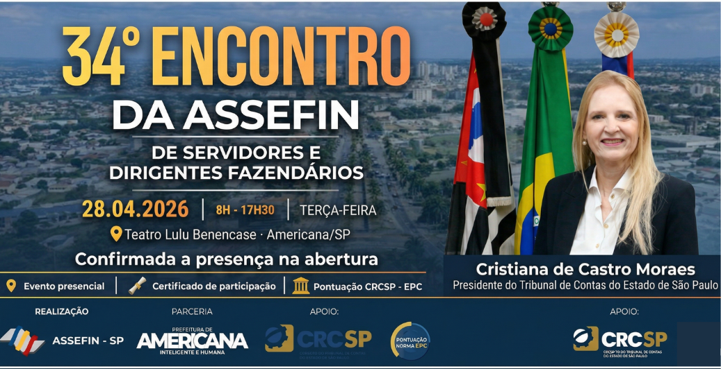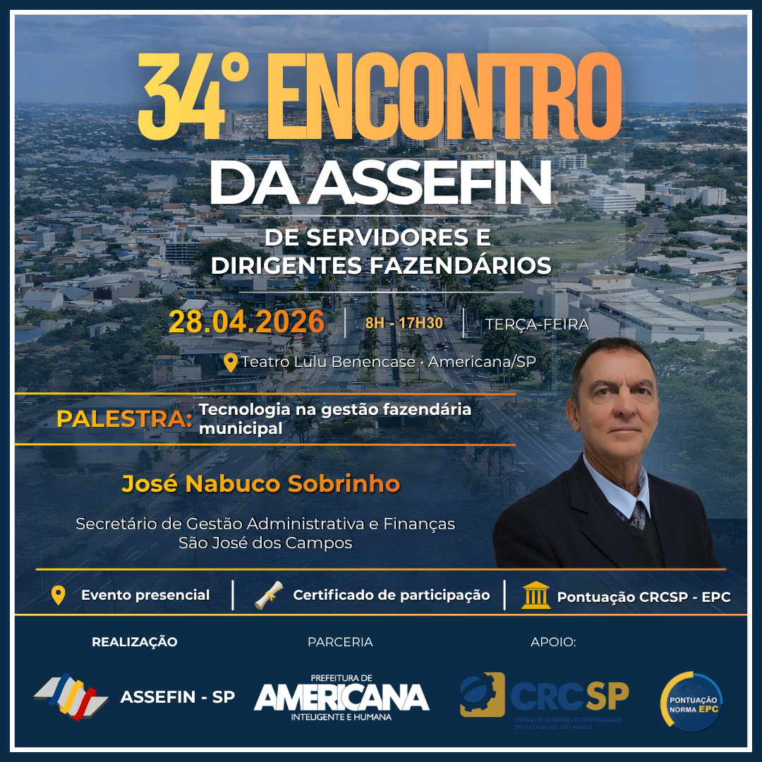 O 34.º Encontro de Servidores e Titulares Fazendários da ASSEFIN-SP, que será realizado no dia 28 de abril de 2026, em Americana/SP, consolida-se como um dos principais espaços de debate técnico e institucional da gestão fazendária municipal no país.