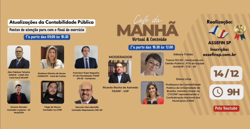 A ASSEFIN, pelo 3.o consecutivo, vai realizar um Café da Manhã (14/12 - 10h*) para tratar dos pontos de atenção com o final do exercício na Contabilidade Pública. As apresentações e debates serão feitos pelas professoras Diana Lima, da UNB e consultora da área na CNM - Confederação Nacional de Municípios, e Débora Tristão, profissional da AUDESP - Divisão de Auditoria Eletrônica, do Tribunal de Contas do Estado de São Paulo.