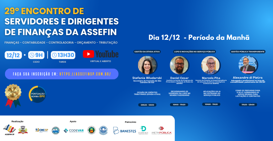 O 29º Encontro Virtual, que será transmitido pelo YouTube no dia 12 de dezembro, inicia sua programação às 9h, com uma série de painéis e palestras focados em gestão da dívida ativa, inovações no serviço público e transparência na gestão pública municipal.
