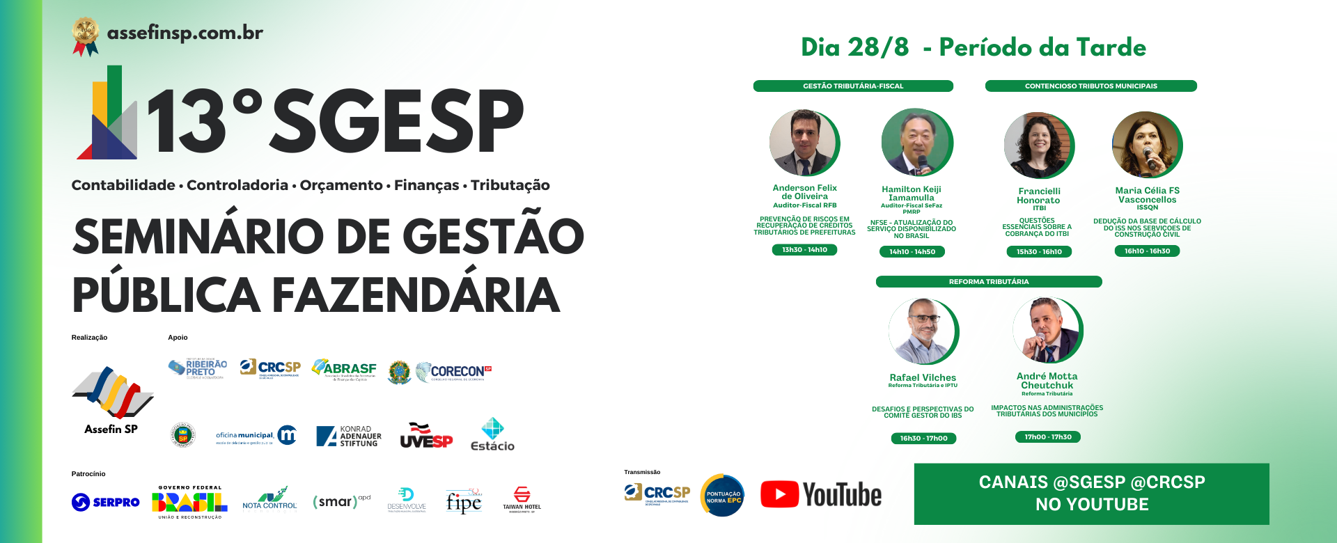 Nos dias 27 e 28 de agosto, o CRCSP (Conselho Regional de Contabilidade de São Paulo) e a ASSEFIN-SP (Associação das Secretarias Municipais do Estado de SP) transmitirão o 13.º SGESP no YouTube. Este evento, que será gratuito e aberto a todos, apresentará uma versão editada e gravada do encontro presencial realizado nos dias 24 e 25 de julho na Universidade Estácio, em Ribeirão Preto. O objetivo é ampliar o alcance das discussões e treinamentos oferecidos aos profissionais da área.