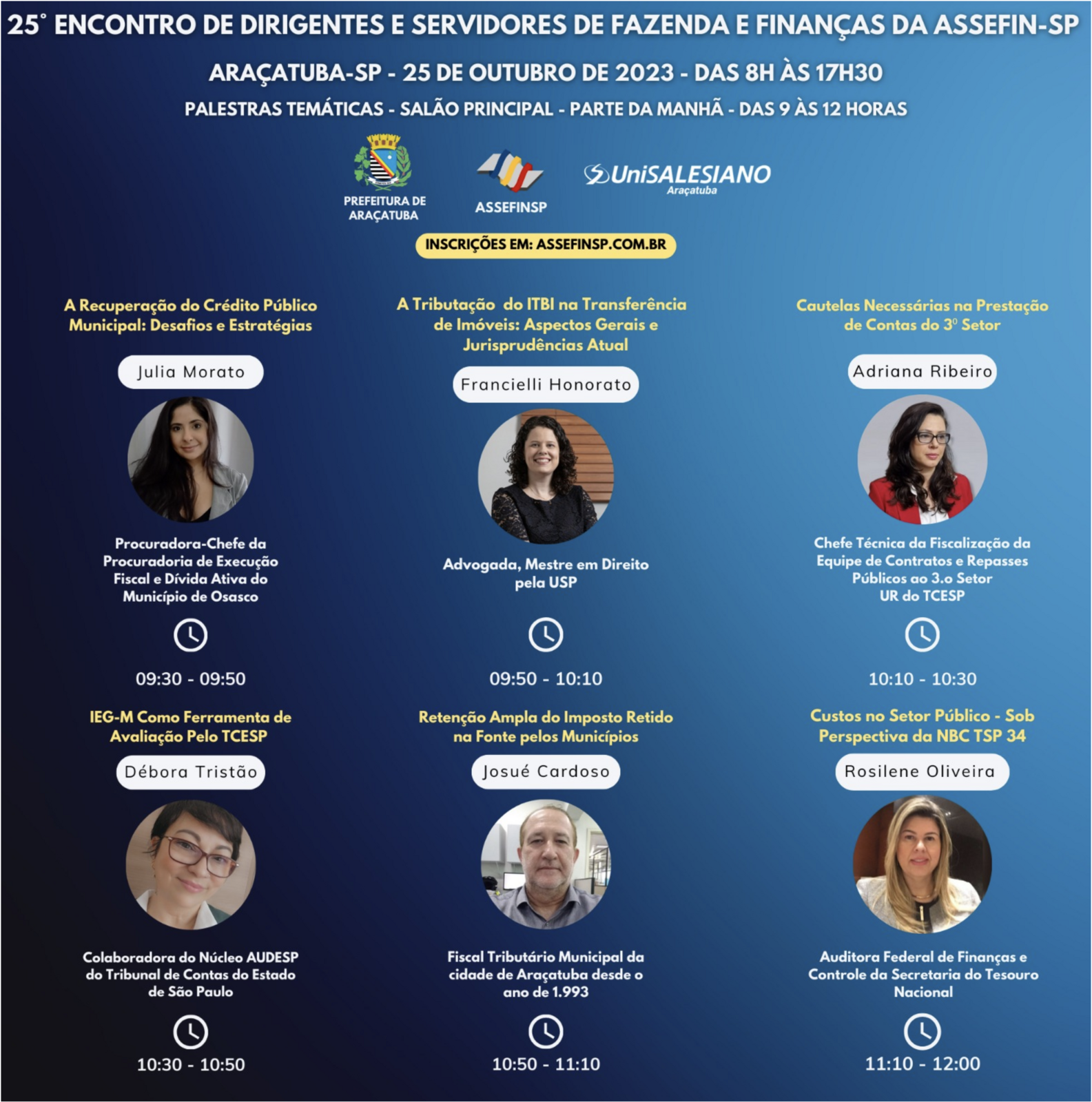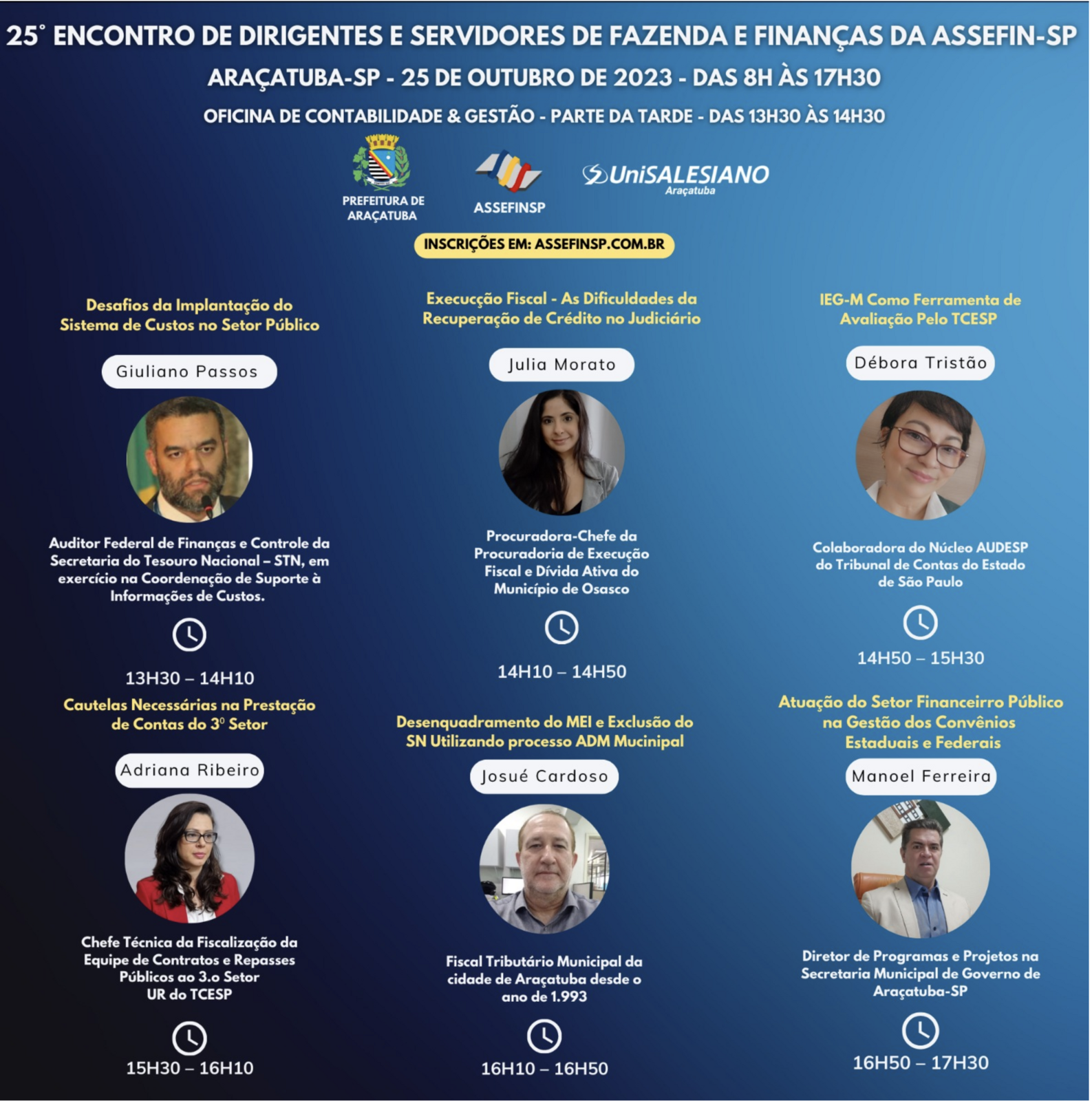 No período da manhã serão apresentados painéis sobre o 3.o Setor, recuperação de créditos (execução fiscal), IEGM, retenção ampla do IRRF e custos no setor público, além desses, à tarde, haverá sobre gestão de convênios com Estado e Federação.