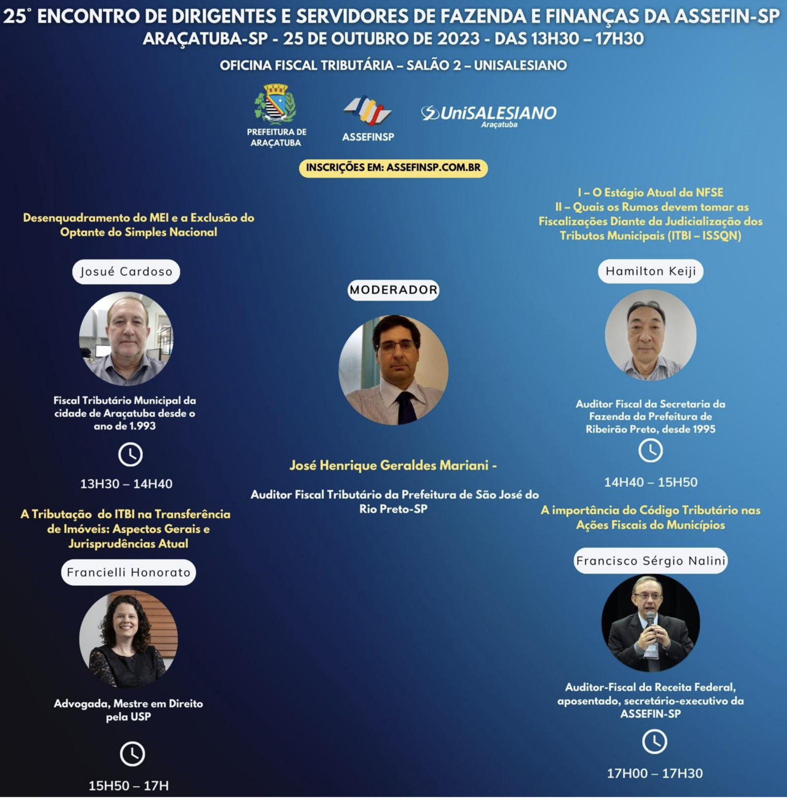 À tarde, além da reunião dos secretários, haverá uma Oficina Fiscal Tributária, com os temas: desenquadramento de MEI e a exclusão optante do Simples Nacional, estágio atual da Nota Fiscal de Serviço eletrônica, a judicialização do ISSQN, a tributação do ITBI e a jurisprudência atual e a importância do Código Tributário nas ações fiscais dos Municípios.