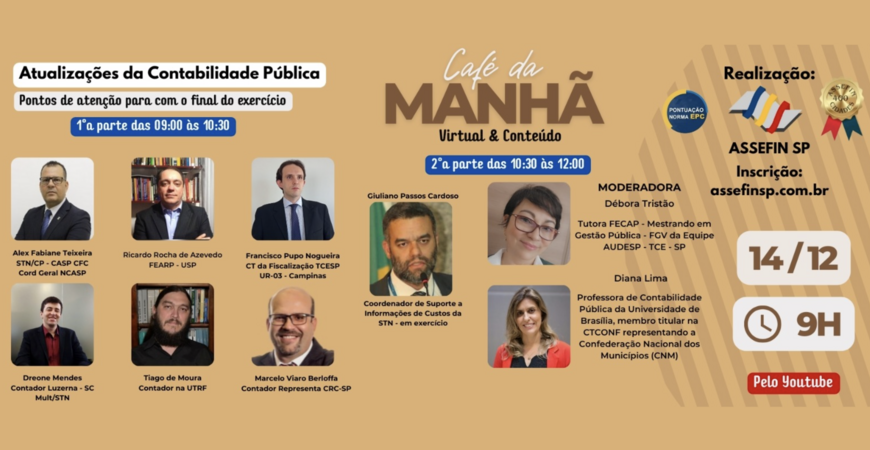 Pelo 3.o ano consecutivo a ASSEFIN vai realizar um Café da Manhã para tratar dos pontos de atenção com o final do exercício na Contabilidade Pública e com um fato extraordinário, a entrada em vigor dia 1.o de janeiro próximo da NBC TSP 34, que regula a contabilização dos custos no setor público. O evento que será realizado quinta-feira que vem, dia 14/12, às 9 horas, será gratuito, pelo YouTube, contará com 9 palestrantes e será dividido em 2 partes de uma hora e meia cada uma.