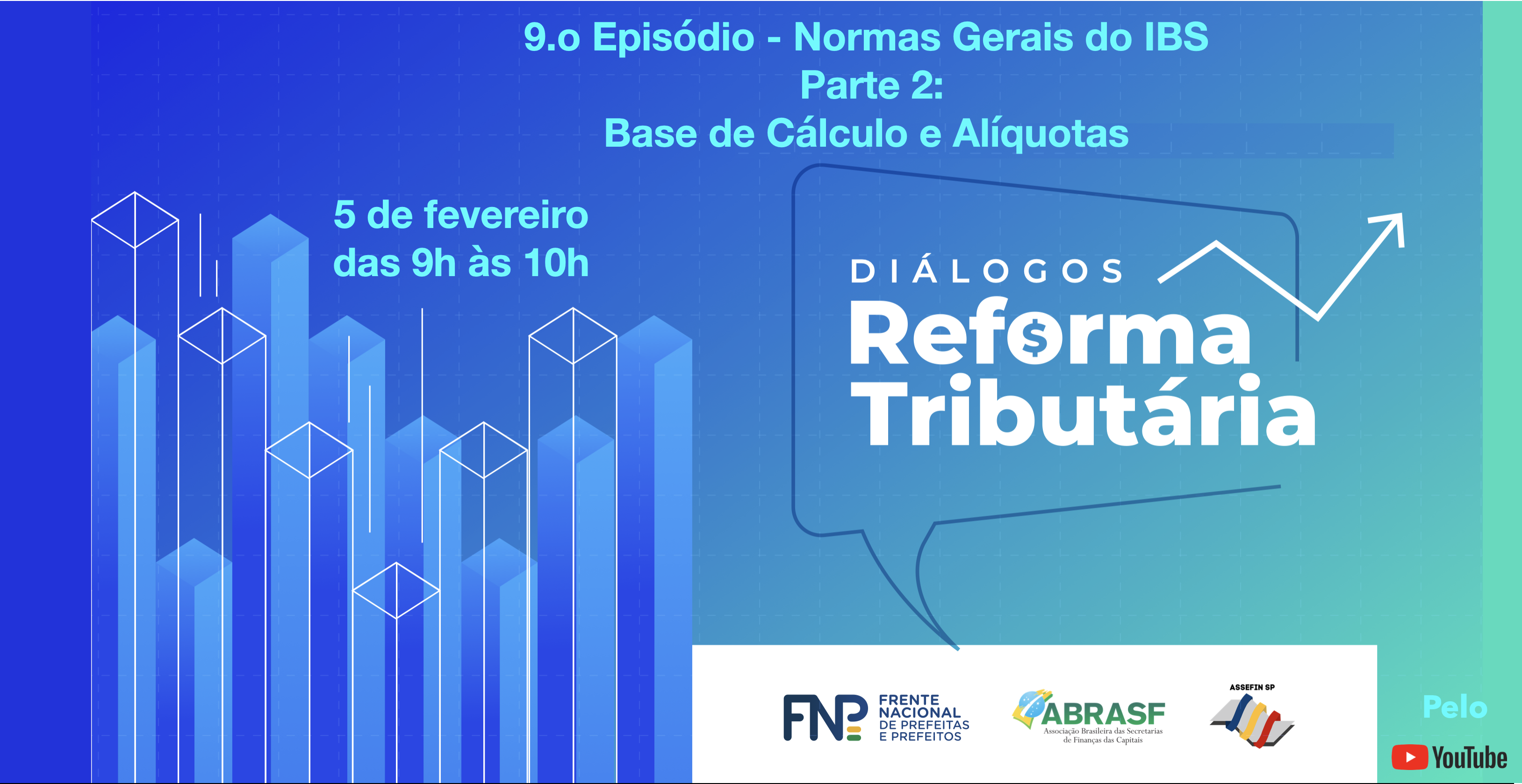 No dia 5 de fevereiro de 2025, quarta-feira, das 9h às 10h, o episódio "Normas Gerais do IBS – Parte 2: Base de Cálculo e Alíquotas" será transmitido ao vivo pelos canais TVFNP e ASSEFIN-SP, aprofundando o debate sobre pontos cruciais da Reforma Tributária.