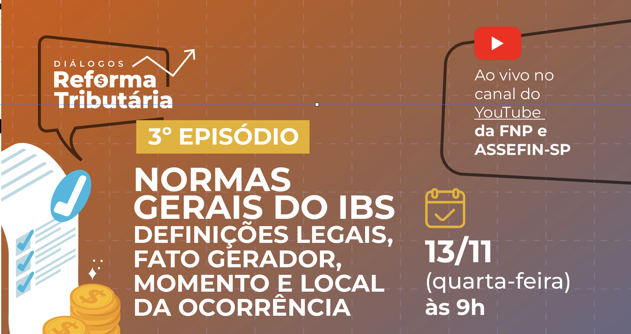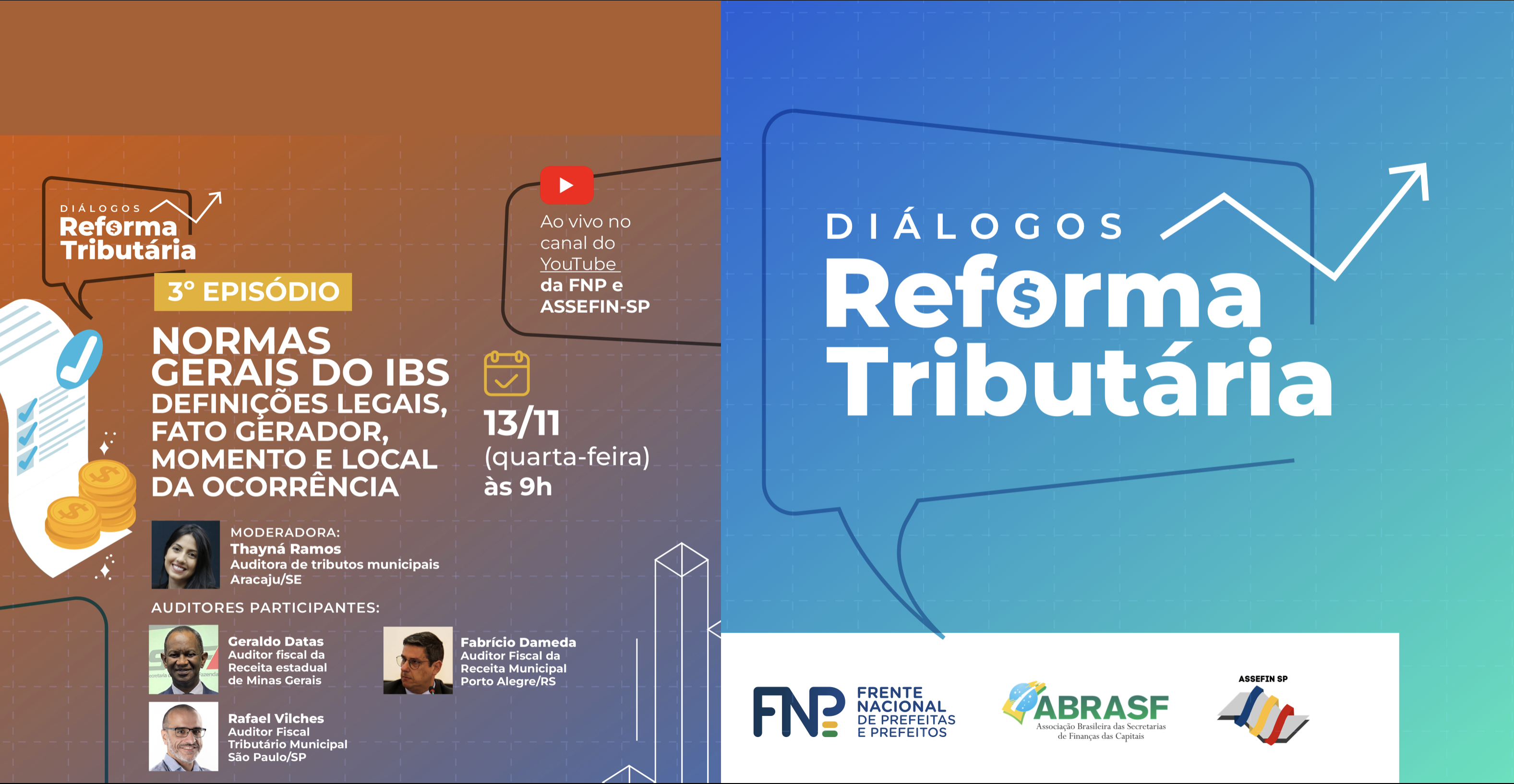 A série de webinários "Diálogos Reforma Tributária", promovida pela FNP, ABRASF e ASSEFIN-SP, avança com seu terceiro episódio, que acontece na quarta-feira, 13 de novembro, ao vivo nos canais do YouTube da @ASSEFIN-SP (<- para assistir clique no nome) e da @TVFNP.