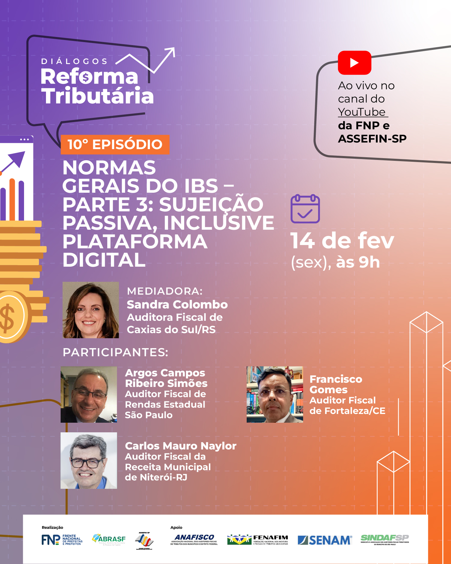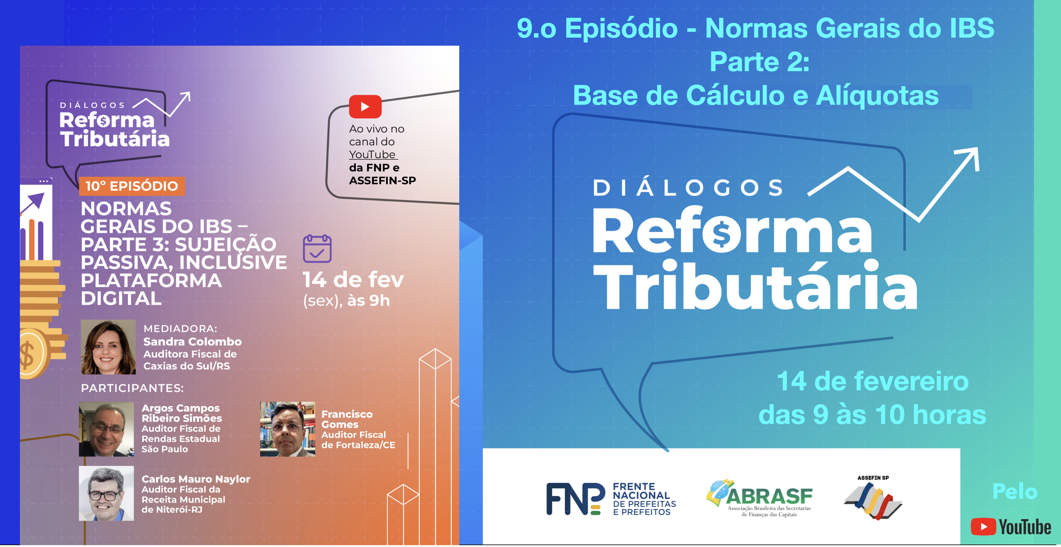No dia 14 de fevereiro de 2025, sexta-feira, das 9h às 10h, o episódio "Normas Gerais do IBS – Parte 3: Sujeição Passiva, Inclusive Plataforma Digital" será transmitido ao vivo pelos canais TVFNP e ASSEFIN-SP, dando continuidade ao aprofundamento da Reforma Tributária.