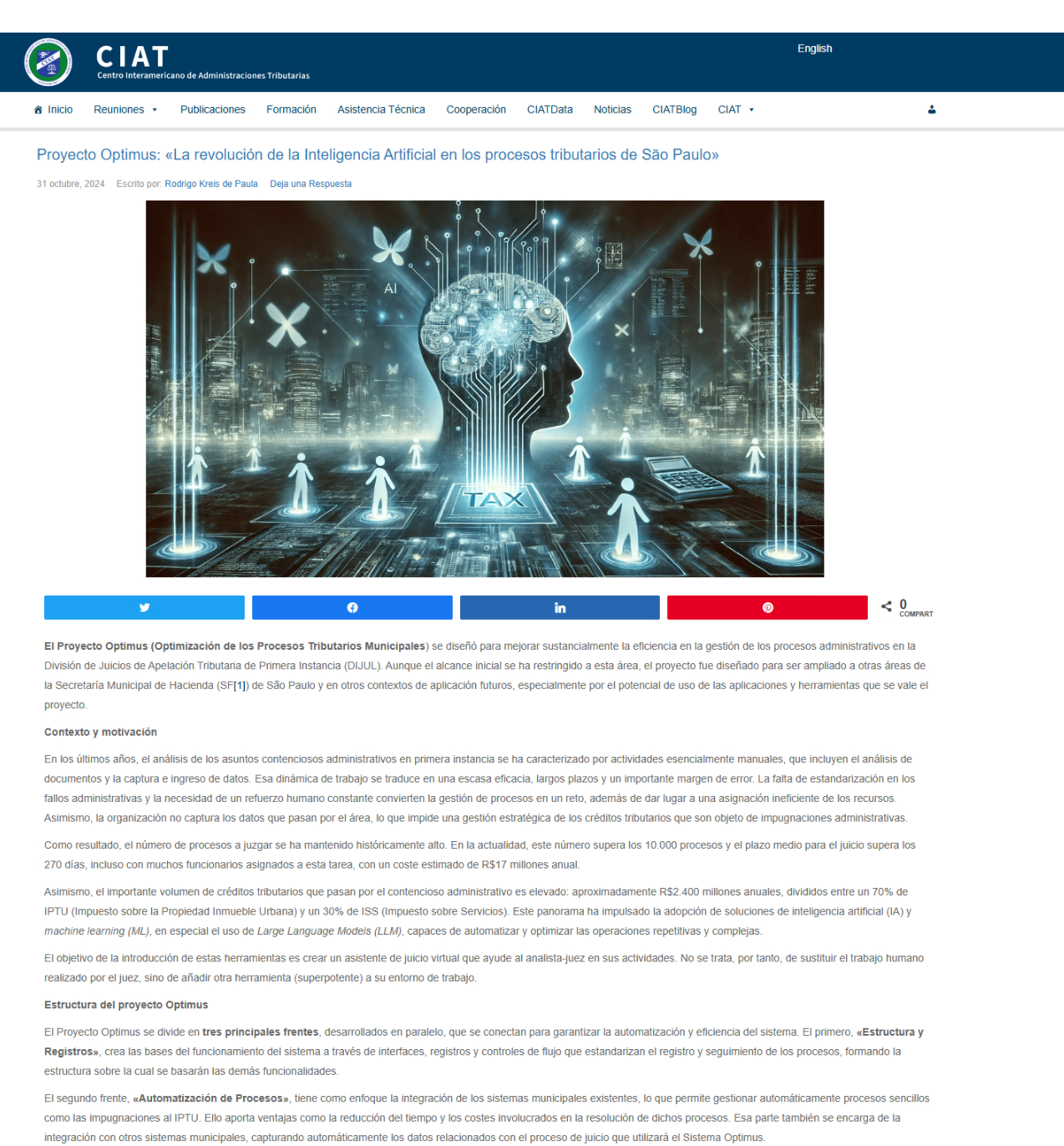 O CIAT publicou artigo técnico assinado por Rodrigo Kreis de Paula, descrevendo a arquitetura e os resultados preliminares do Projeto OPTIMUS, inicialmente focado na Divisão de Julgamentos de 1.ª Instância (DIJUL).