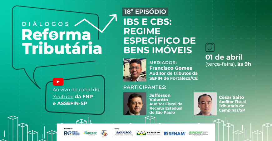 A Frente Nacional de Prefeitos (FNP), a Associação Brasileira das Secretarias de Finanças das Capitais (ABRASF) e a Associação das Secretarias Municipais de Finanças do Estado de São Paulo (ASSEFIN-SP) promovem, no dia 1º de abril de 2025, terça-feira, das 9h às 10h (horário de Brasília), o 18º episódio da série "Diálogos Reforma Tributária", com transmissão ao vivo pelos canais TVFNP e ASSEFIN-SP.