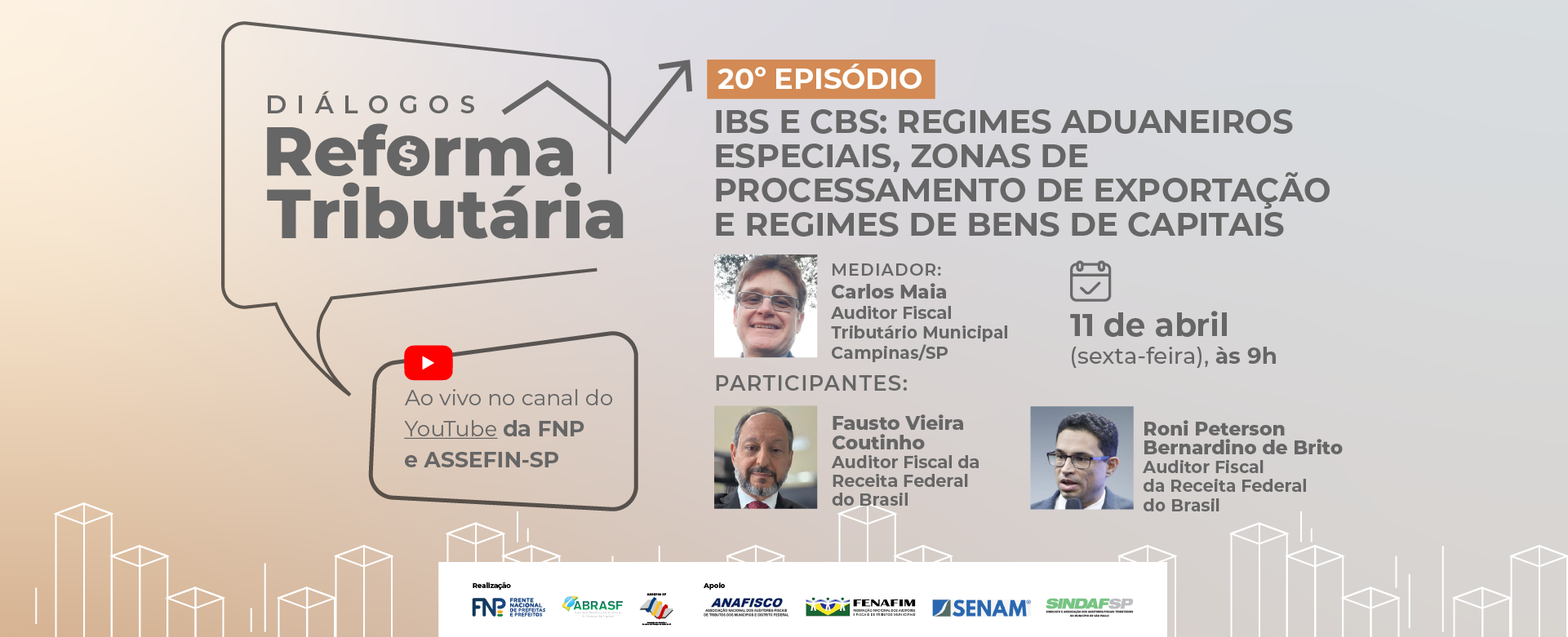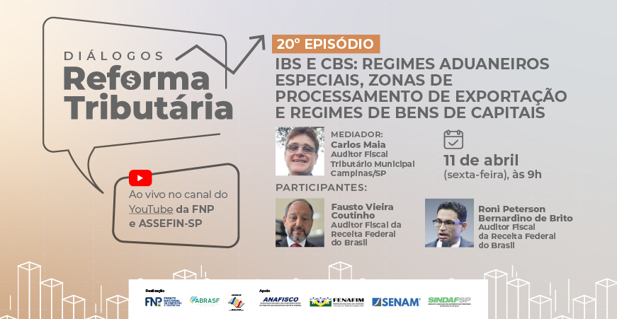 A Frente Nacional de Prefeitos (FNP), a Associação Brasileira das Secretarias de Finanças das Capitais (ABRASF) e a Associação das Secretarias Municipais de Finanças do Estado de São Paulo (ASSEFIN-SP) promovem, no dia 11 de abril de 2025 (sexta-feira), das 9h às 10h (horário de Brasília), o 20º episódio da série "Diálogos Reforma Tributária", com transmissão ao vivo pelos canais TVFNP e ASSEFIN-SP.