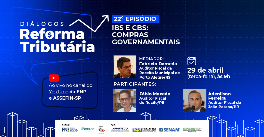 A Frente Nacional de Prefeitos (FNP), a Associação Brasileira das Secretarias de Finanças das Capitais (ABRASF) e a Associação das Secretarias Municipais de Finanças do Estado de São Paulo (ASSEFIN-SP) promovem, no dia 29 de abril de 2025 (terça-feira), das 9h às 10h (horário de Brasília), o 22º episódio da série "Diálogos Reforma Tributária", com transmissão ao vivo pelos canais TVFNP e ASSEFIN-SP.