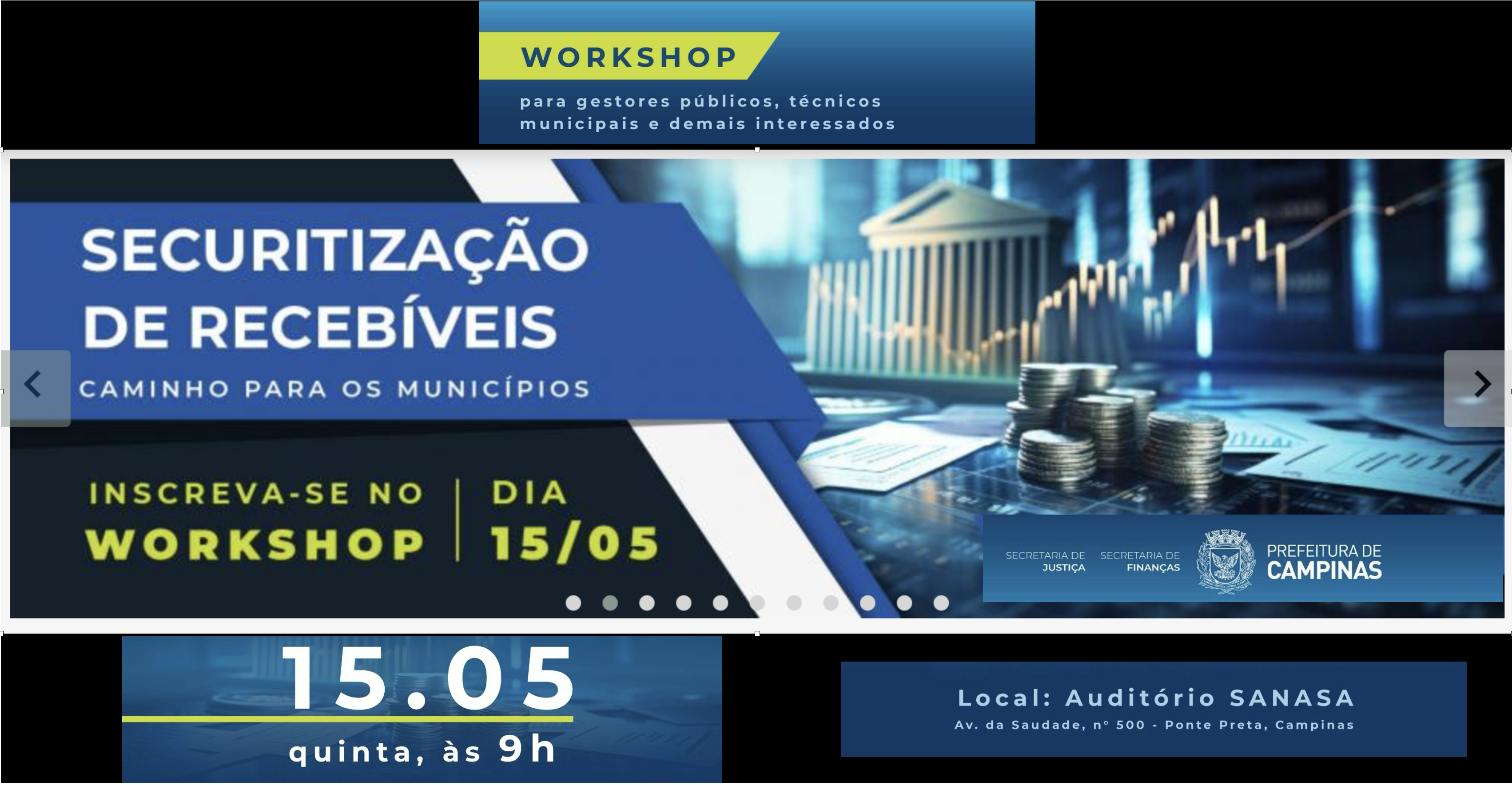 A Prefeitura de Campinas promove no dia 15 de maio de 2025 o Workshop – Securitização de Recebíveis: Caminho para os Municípios, reunindo especialistas, consultores e gestores públicos em um debate técnico sobre oportunidades e desafios da securitização como ferramenta de gestão financeira municipal.