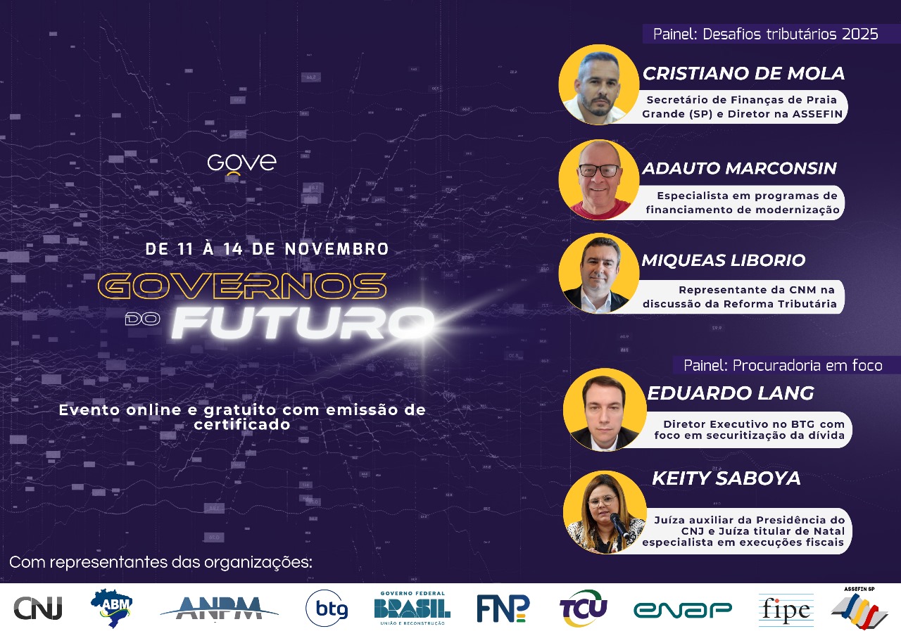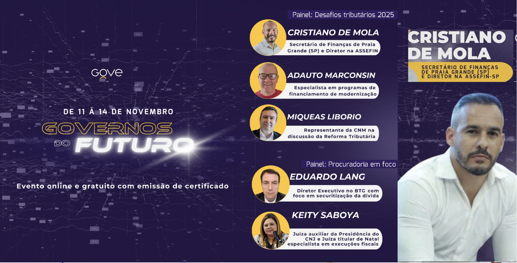 Cristiano de Mola, Secretário de Finanças de Praia Grande (SP), e Diretor de Expansão da ASSEFIN-SP, irá compartilhar sua experiência em modernização e eficiência da arrecadação, que posicionou Praia Grande entre as cidades com melhor governança fiscal. Ele se junta a Adauto Marconsin, consultor da FIPE e da Frente Nacional de Prefeitos (FNP), especialista em programas de financiamento para a modernização tributária, e a Miqueas Liborio, auditor fiscal e consultor da Confederação Nacional dos Municípios (CNM), conhecido por seu trabalho em estratégias fiscais inovadoras.