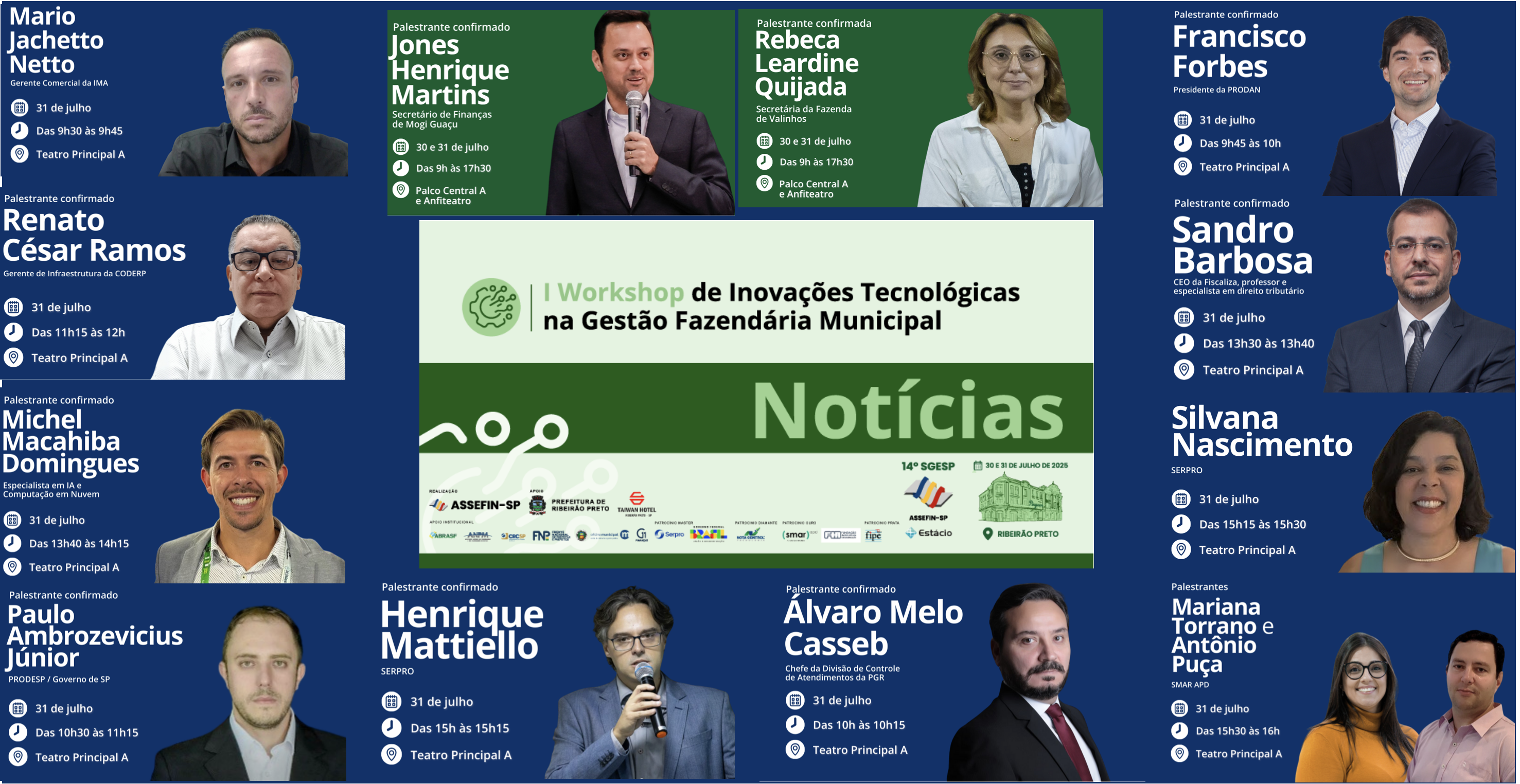 Pela primeira vez, o palco principal do SGESP será reservado para um workshop técnico de dia inteiro, com foco exclusivo em inovação tecnológica no setor público fazendário. O Workshop de Inovações Tecnológicas na Gestão Fazendária Municipal será realizado no dia 31 de julho, dentro da programação do 14.º SGESP, com curadoria do SERPRO e da CODERP. A atividade reunirá especialistas de empresas públicas de TI, gestores de municípios associados e representantes de startups e universidades.
