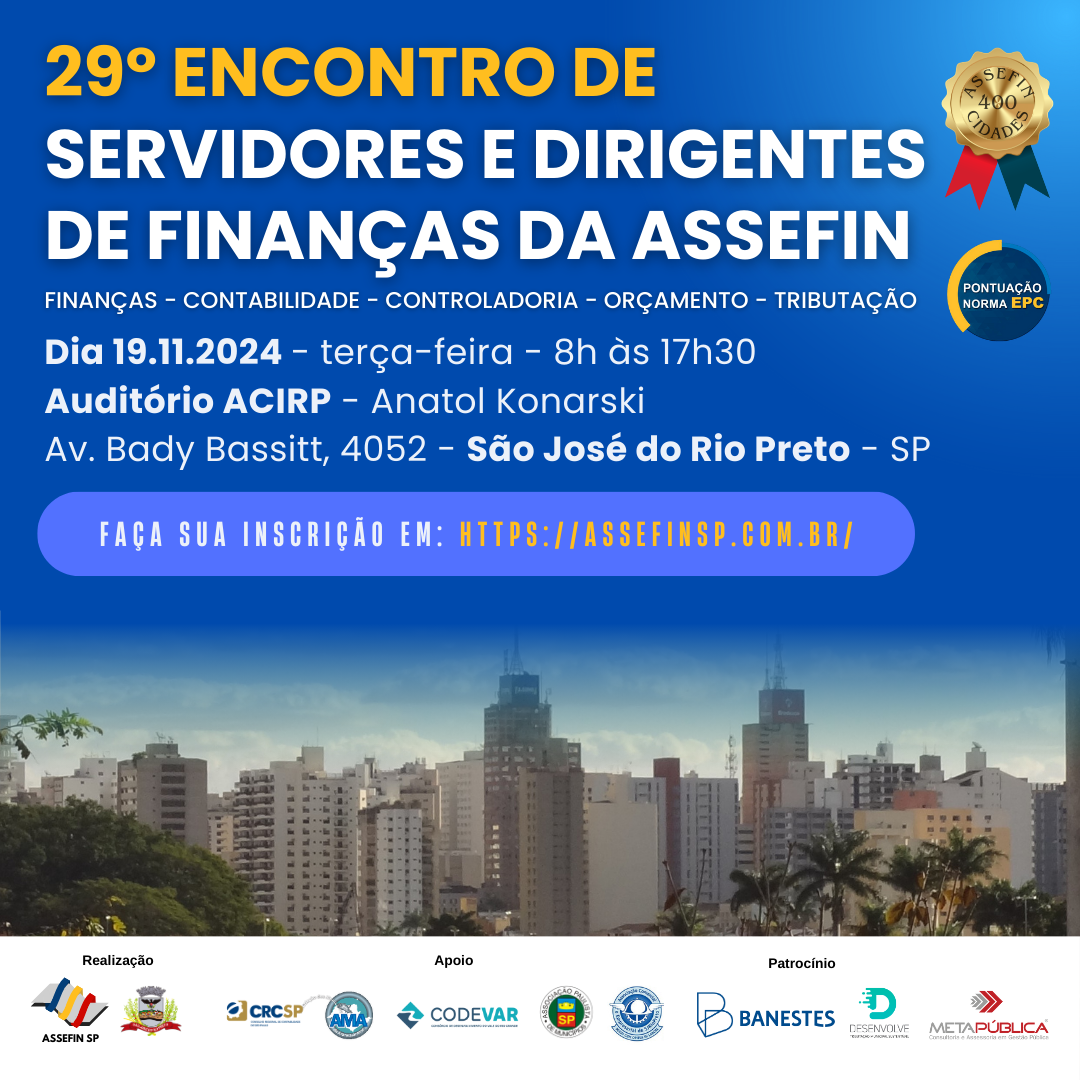 As inscrições para o 29.º Encontro de Servidores e Dirigentes Fazendários, que será realizado em São José do Rio Preto no dia 19 de novembro, estão oficialmente abertas! Organizado pela Associação das Secretarias Municipais do Estado de São Paulo (ASSEFIN) e pela Secretaria da Fazenda de São José do Rio Preto (SEMFAZ), o evento, que é gratuito, reunirá especialistas e servidores de todo o estado para discutir os principais desafios e avanços na área fazendária municipal.