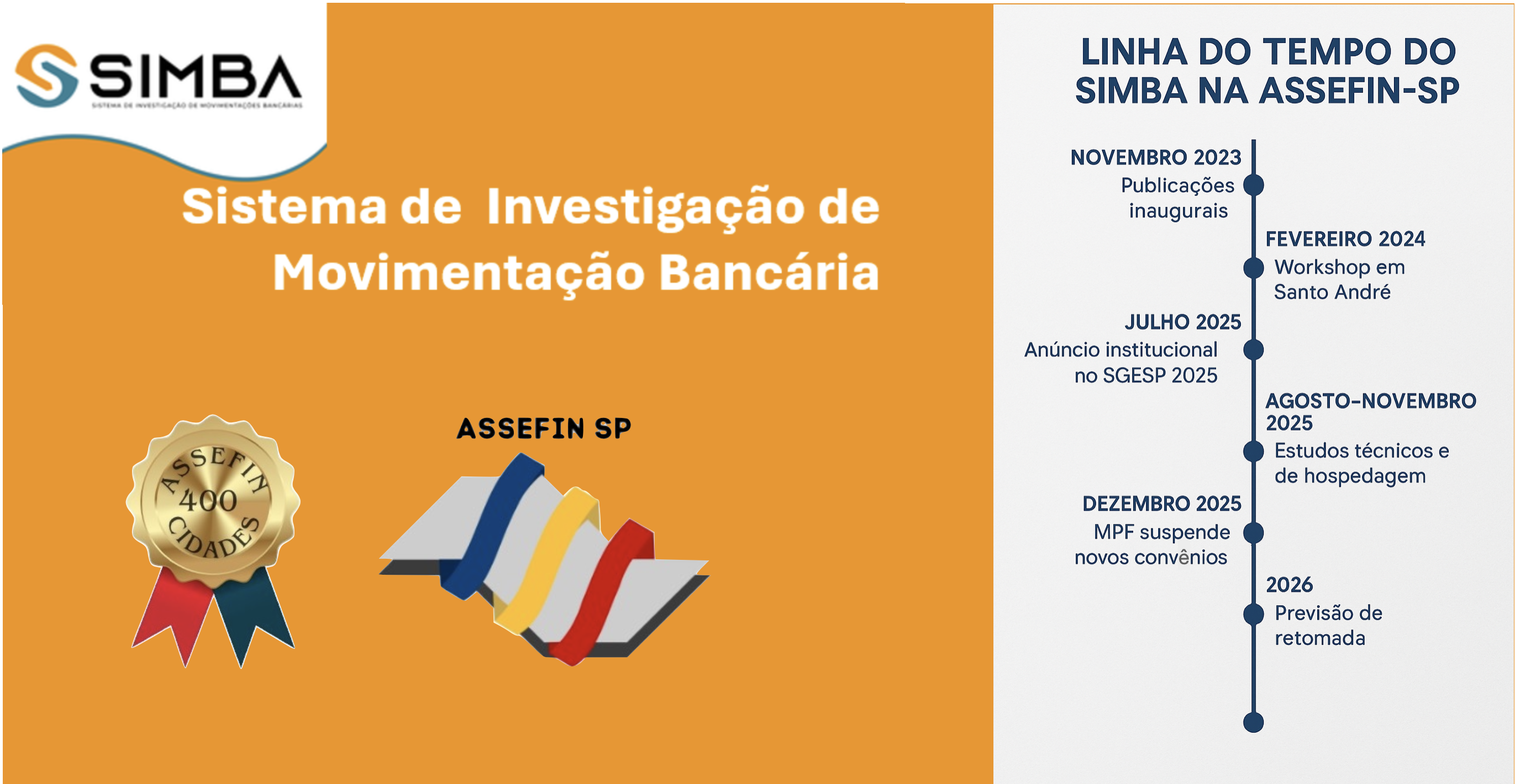 A trajetória do SIMBA – Sistema de Investigação de Movimentações Bancárias, no âmbito da ASSEFIN-SP, não é episódica nem recente. Trata-se de um processo progressivo, técnico e institucional, iniciado em 2023, amadurecido ao longo de 2024 e 2025, e que projeta seus próximos passos para 2026.