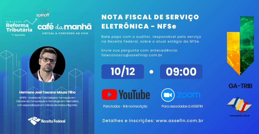 A ASSEFIN dará início a uma série derivativa da Diálogos Reforma Tributária, com a realização do evento Café da Manhã-Virtual & Conteúdo, que contará com a participação de Hermano José Toscano Moura Filho, Auditor-Fiscal da Receita Federal do Brasil (AFRF), responsável pelo programa da Nota Fiscal de Serviço Eletrônica (NFSe).